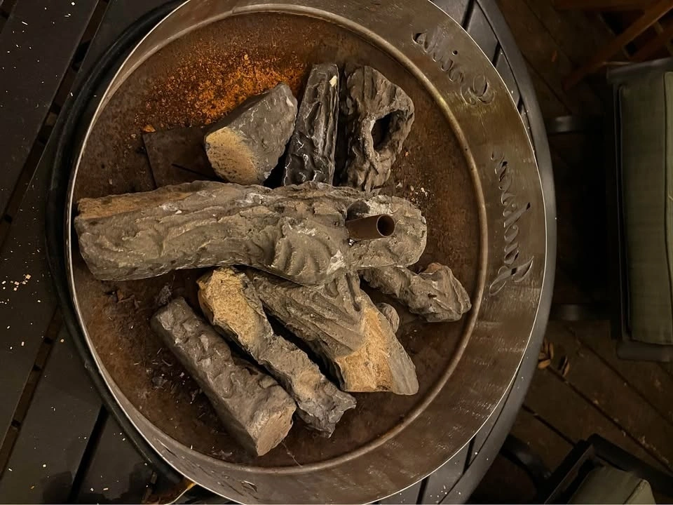 Solid stainless + steel build. Comes with ceramic logs. Perfect for patios and winter evenings. Cosmetic wear on lid but fully functional.