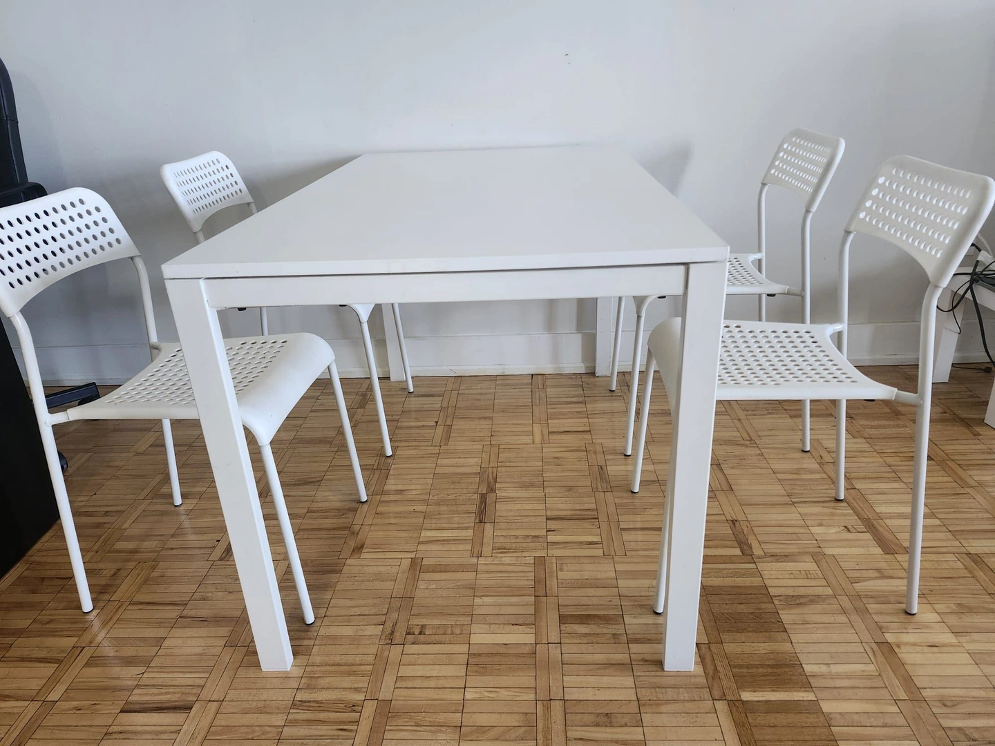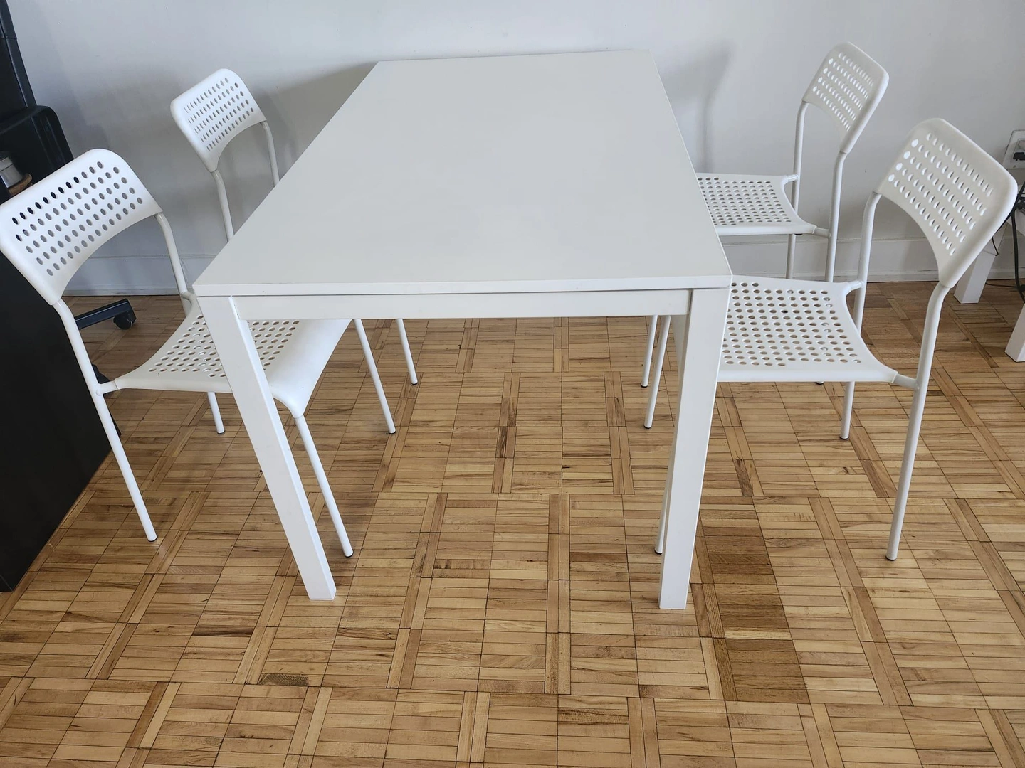 Selling a white IKEA table with four matching chairs. The set is in great condition and perfect for a small dining area or kitchen. The table and chairs are lightweight and easy to move around. The chairs have a comfortable, slightly flexible back. The table is easy to wipe clean