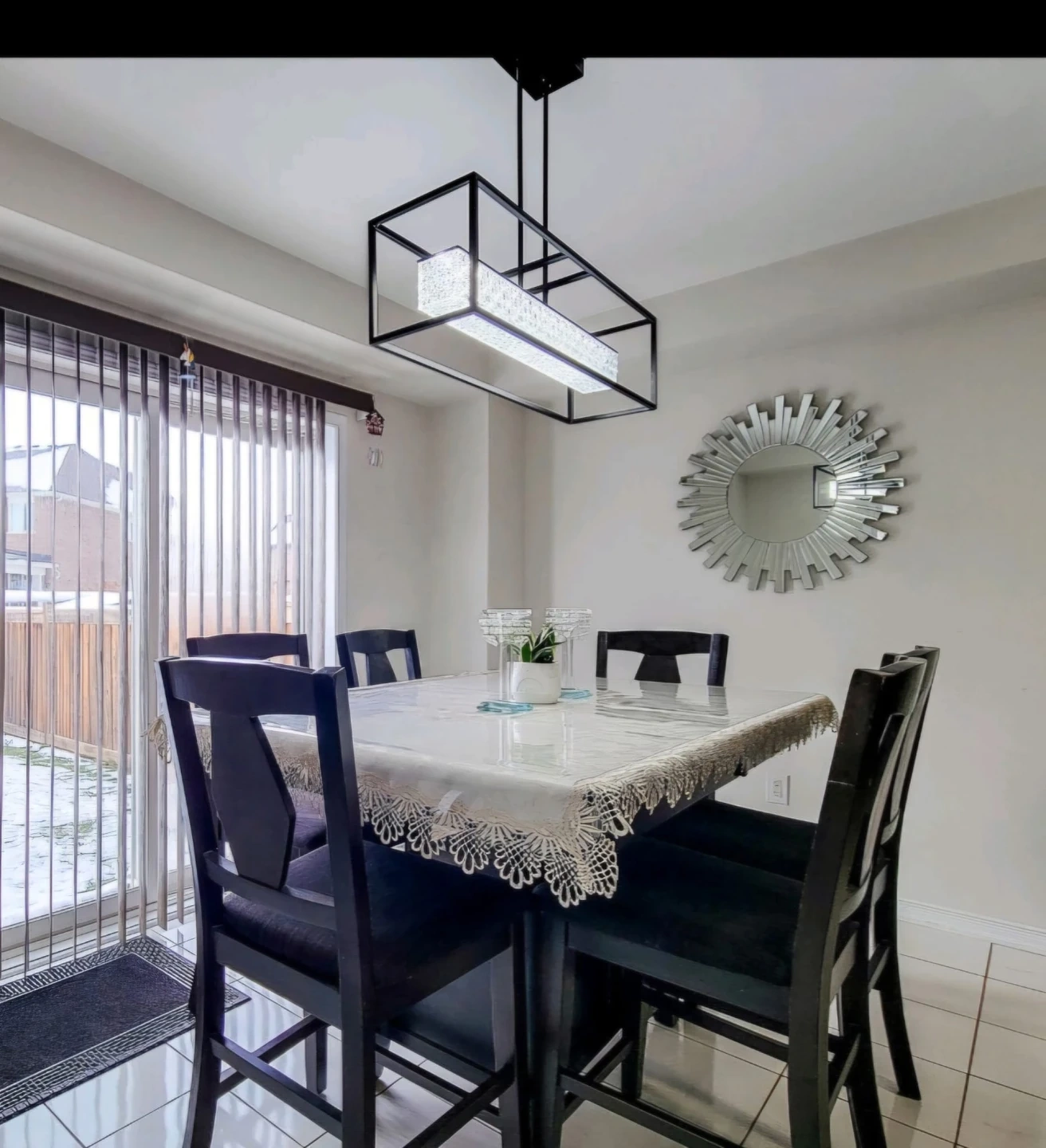 Dining Room Set with Black Chairs and Rectangular Light Fixture