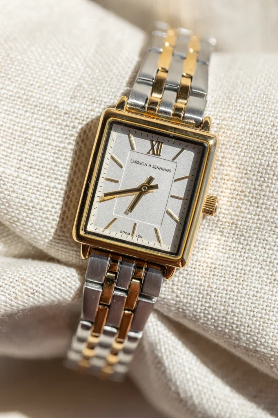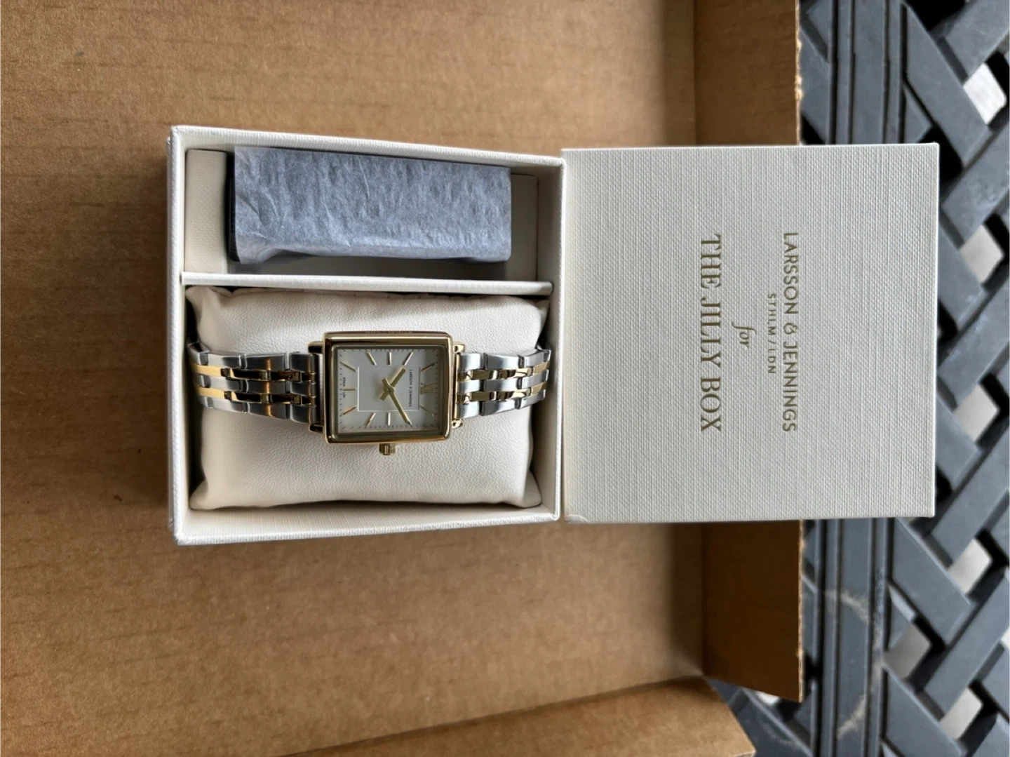 Selling a Larsson & Jennings watch from The Jilly Box! This watch features a rectangular face and a two-tone silver and gold bracelet. It comes with the original box