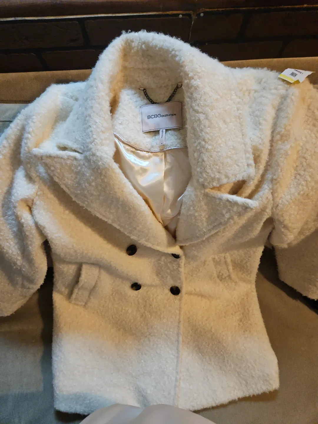 Selling a BCBGeneration cream boucle jacket. It's in great condition and ready for a new owner! The jacket features a soft boucle texture and a stylish design.