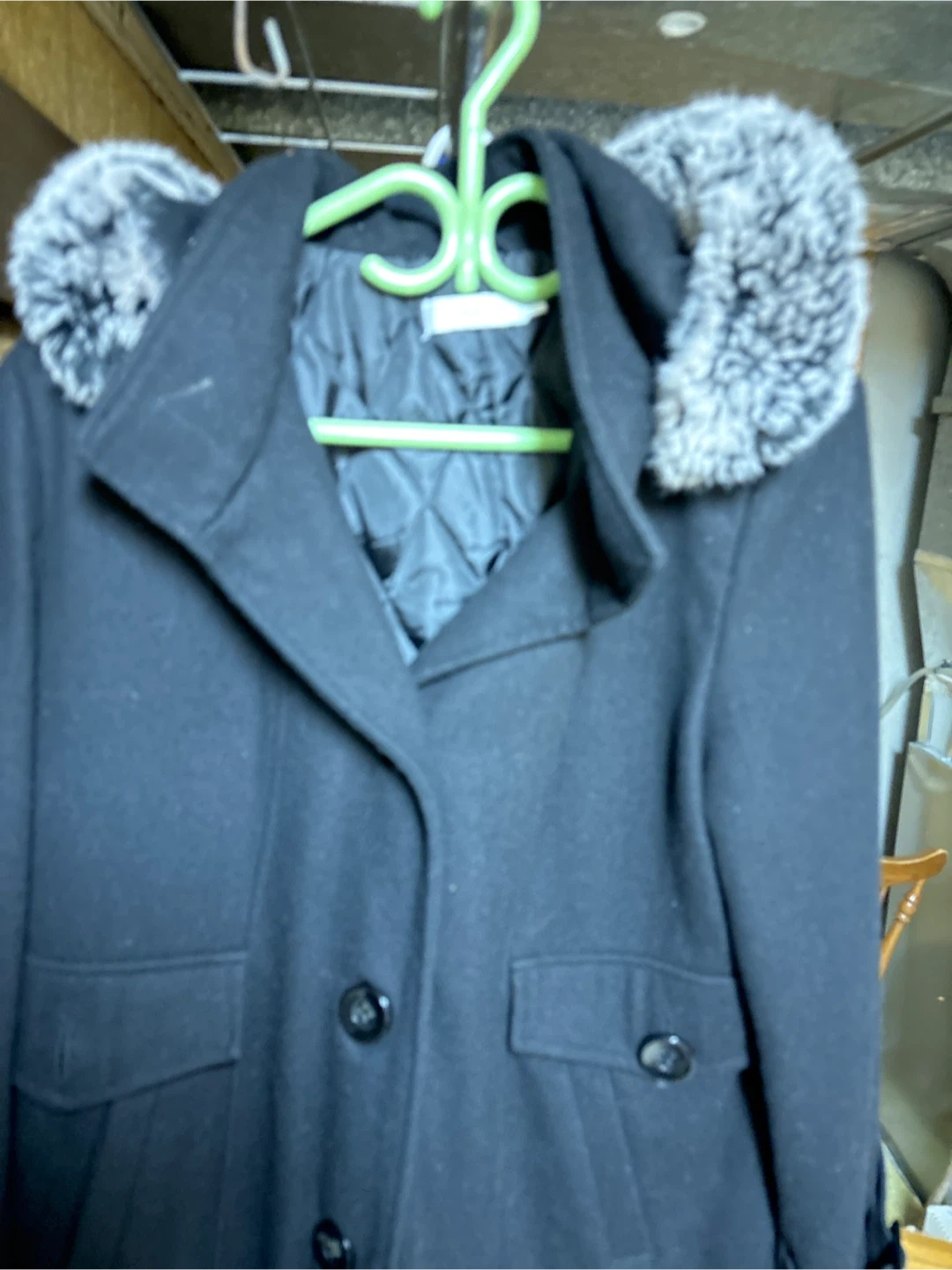 A stylish black winter coat from Rickis. It features a faux fur hood to keep you warm and cozy during the colder months. Perfect for adding a touch of elegance to your winter wardrobe!