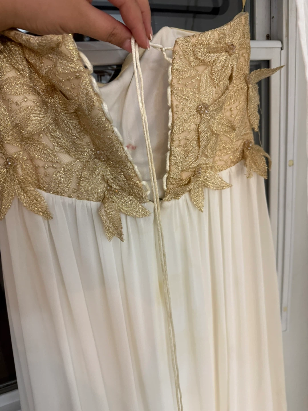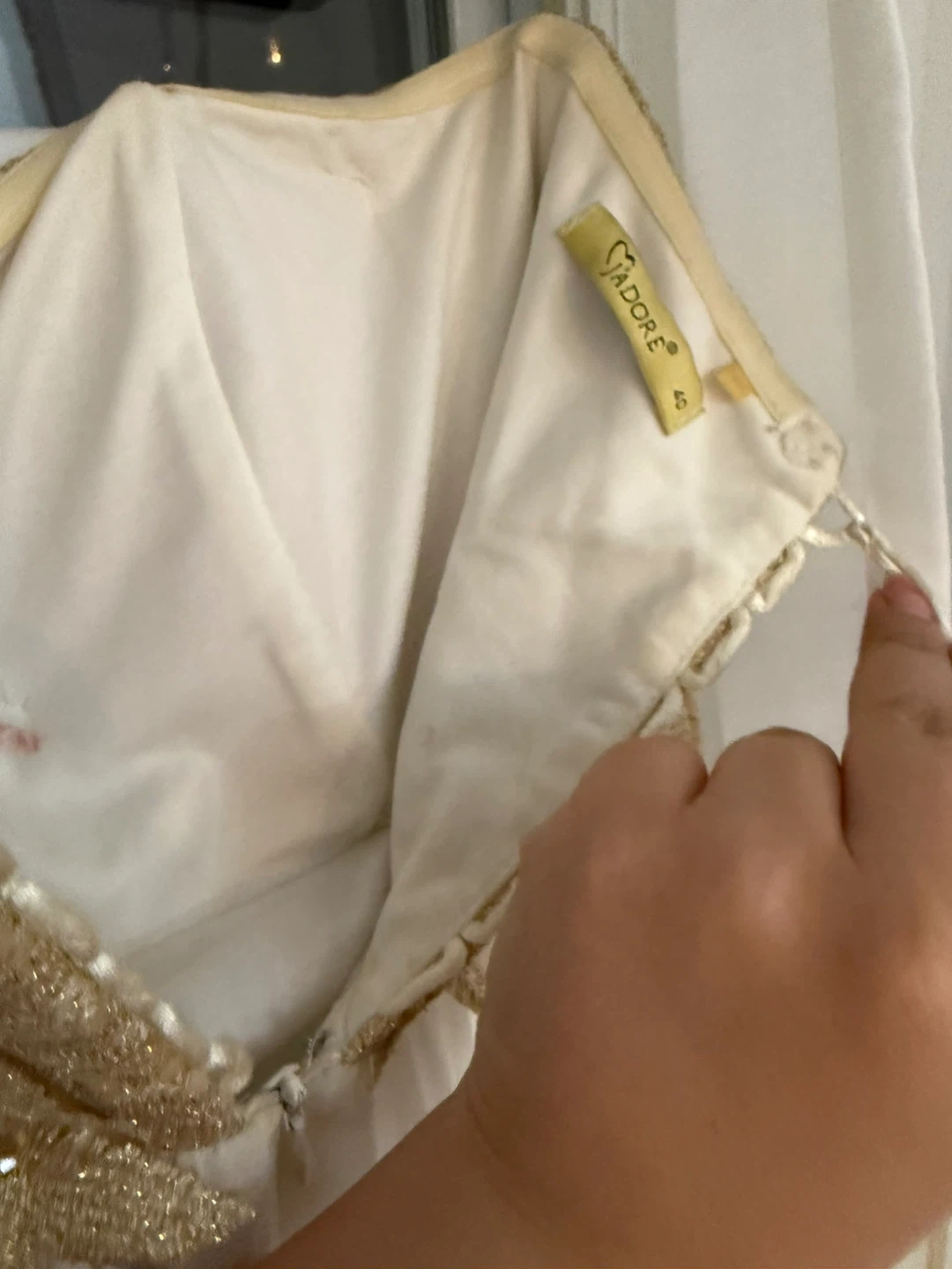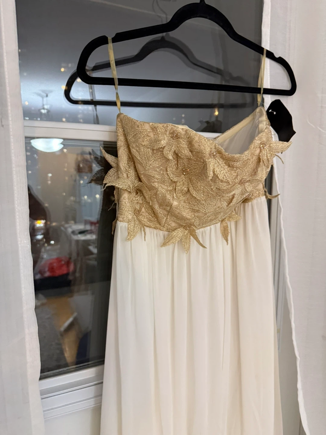 Selling a beautiful Adore dress in size 40 from Zanas Boutique! It features a stunning gold floral bodice and a flowing white skirt, perfect for a special occasion