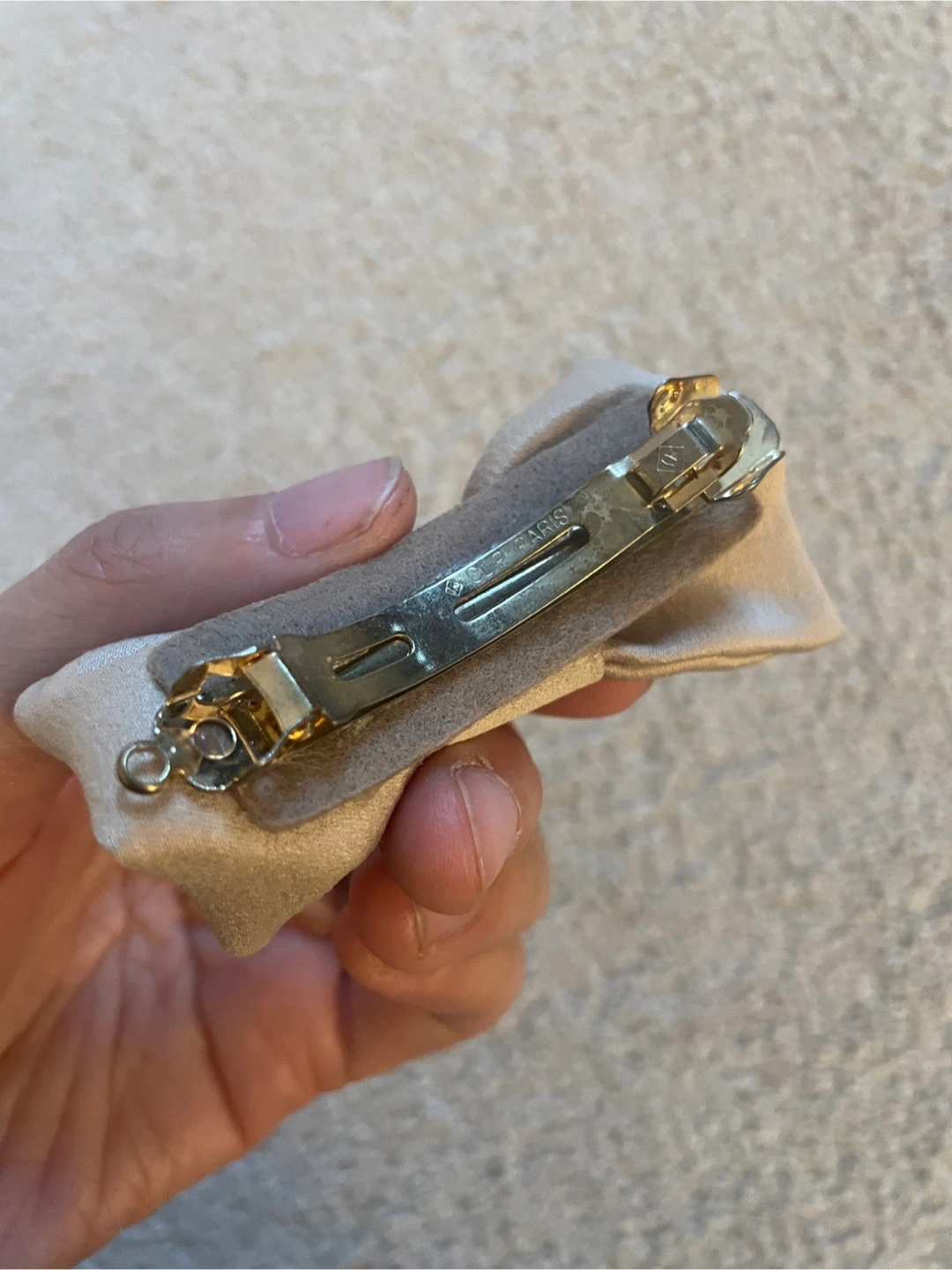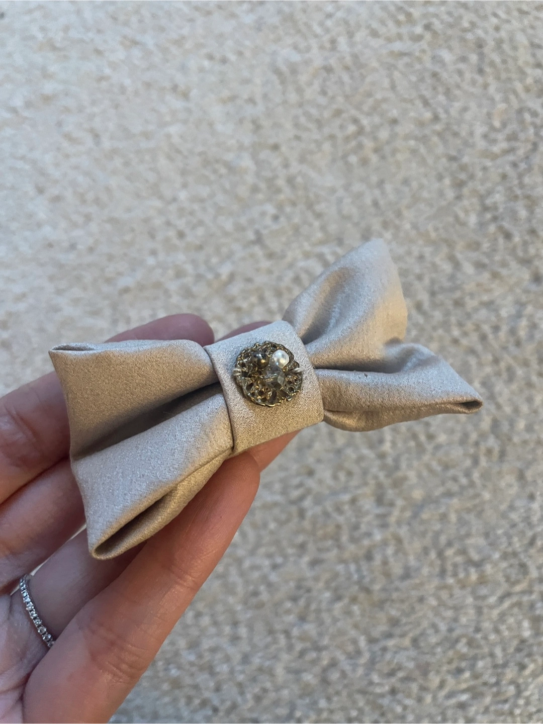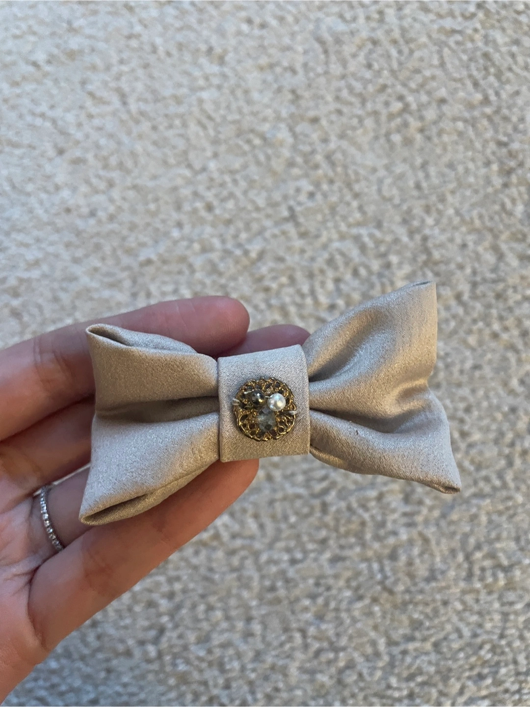 This is a cute beige bow hair clip! It features a beautiful pearl accent in the centre. Perfect for adding a touch of elegance to any hairstyle