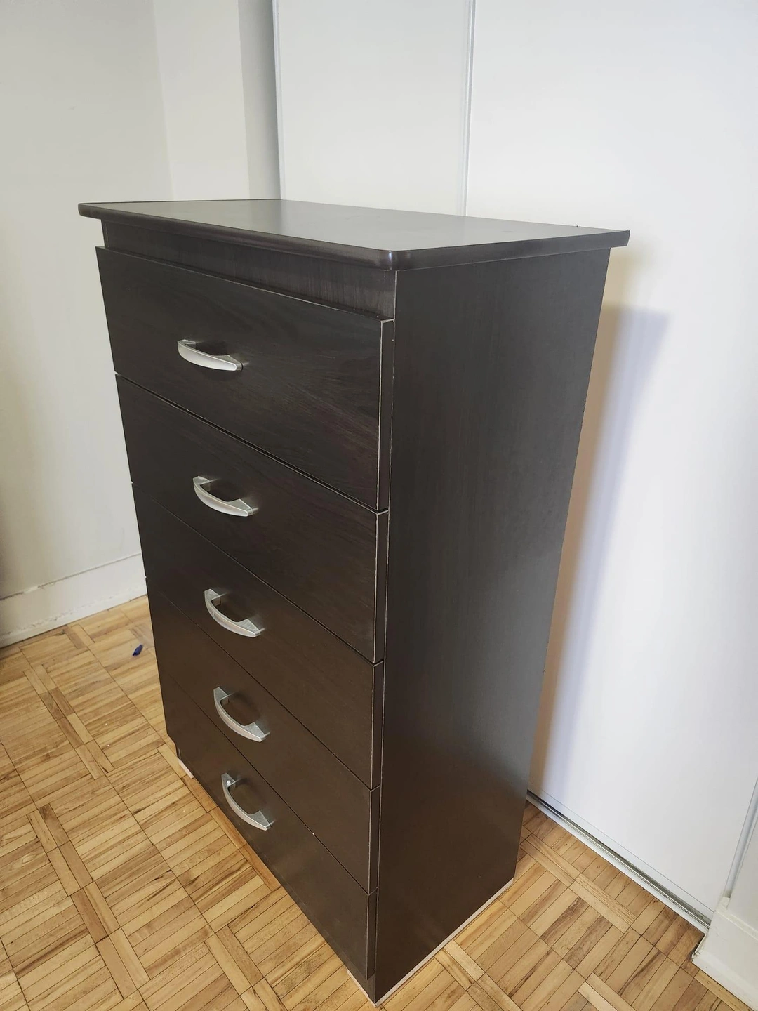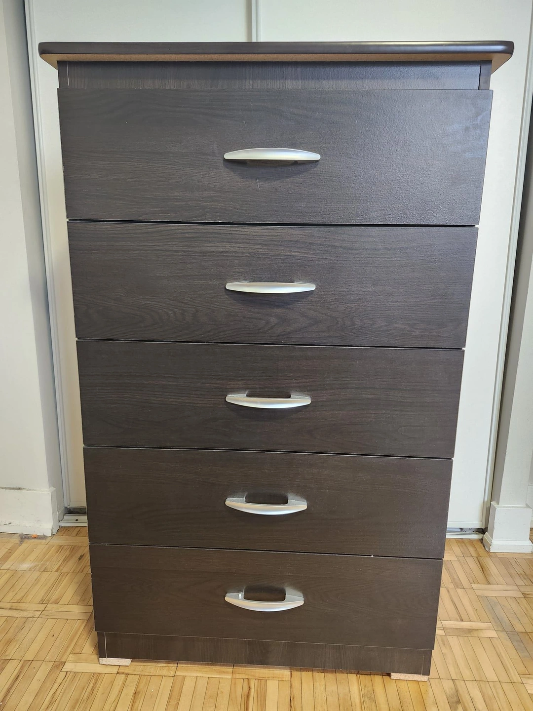 Here's a dark brown 5-drawer dresser that's perfect for adding storage to any room. It's in great condition and ready to use. The drawers slide smoothly, making it easy to access your clothes and other items