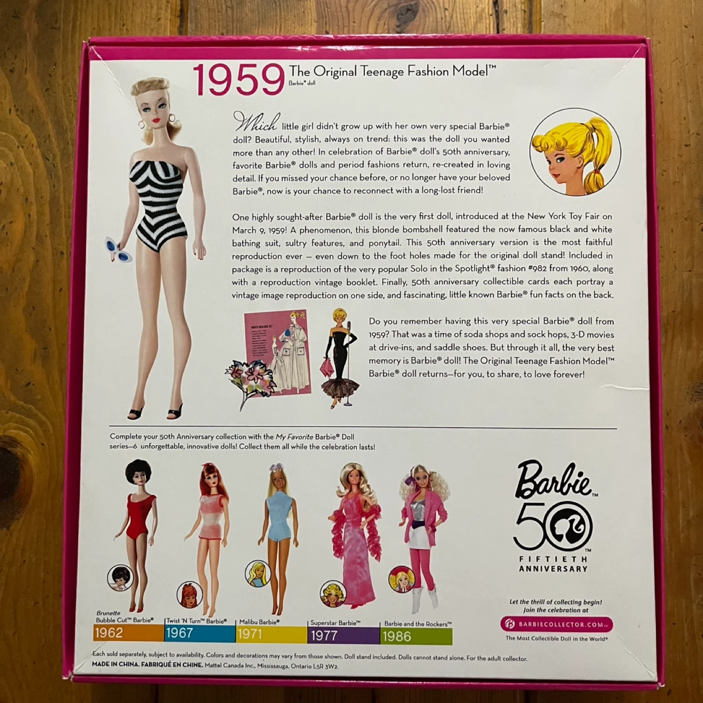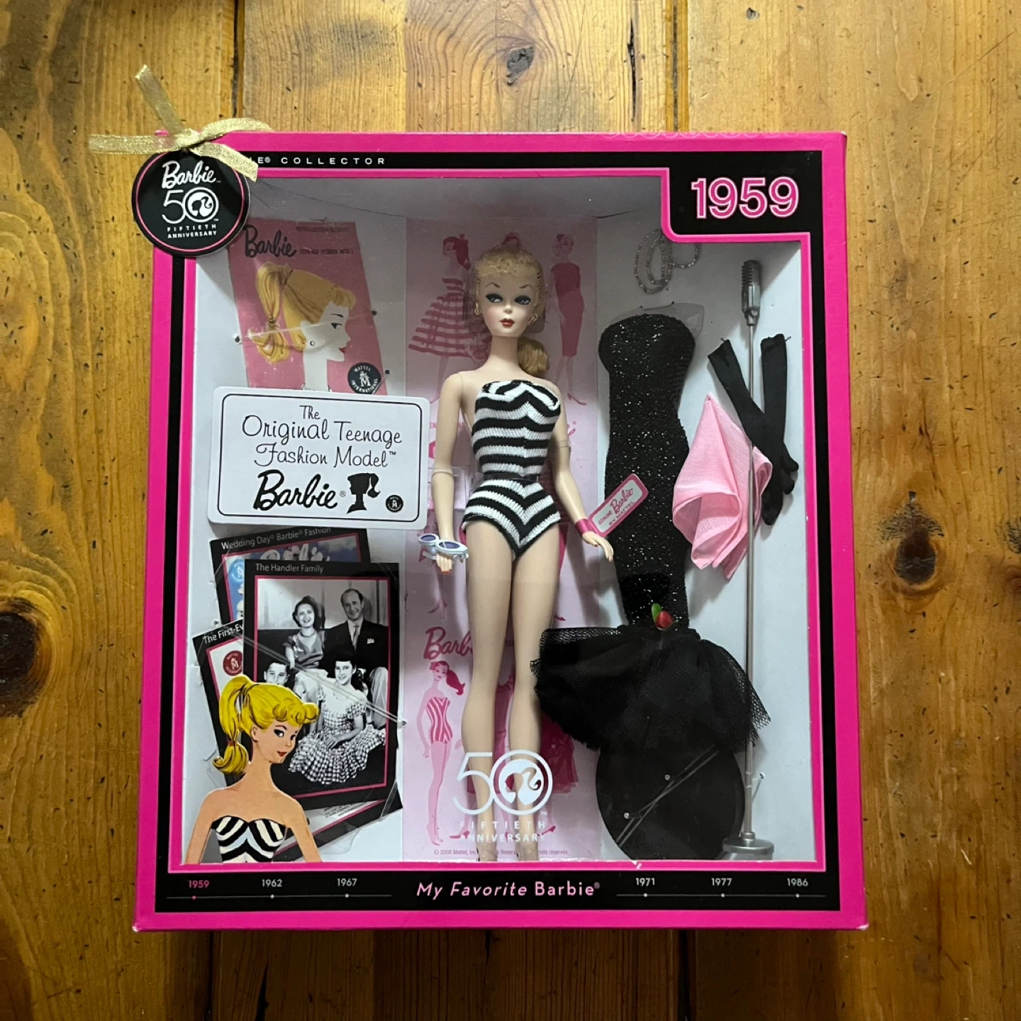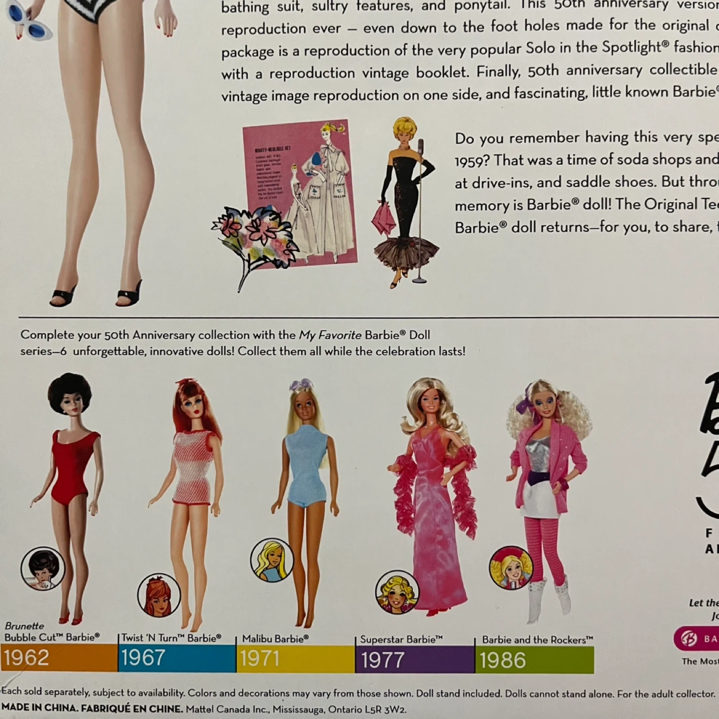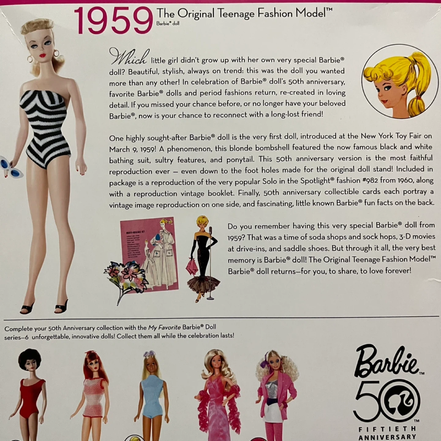 Selling a 50th Anniversary Barbie (1959 Edition) collector doll from 2009. This is a collector’s release celebrating the original 1959 Barbie, recreated with classic details and vintage-inspired styling.