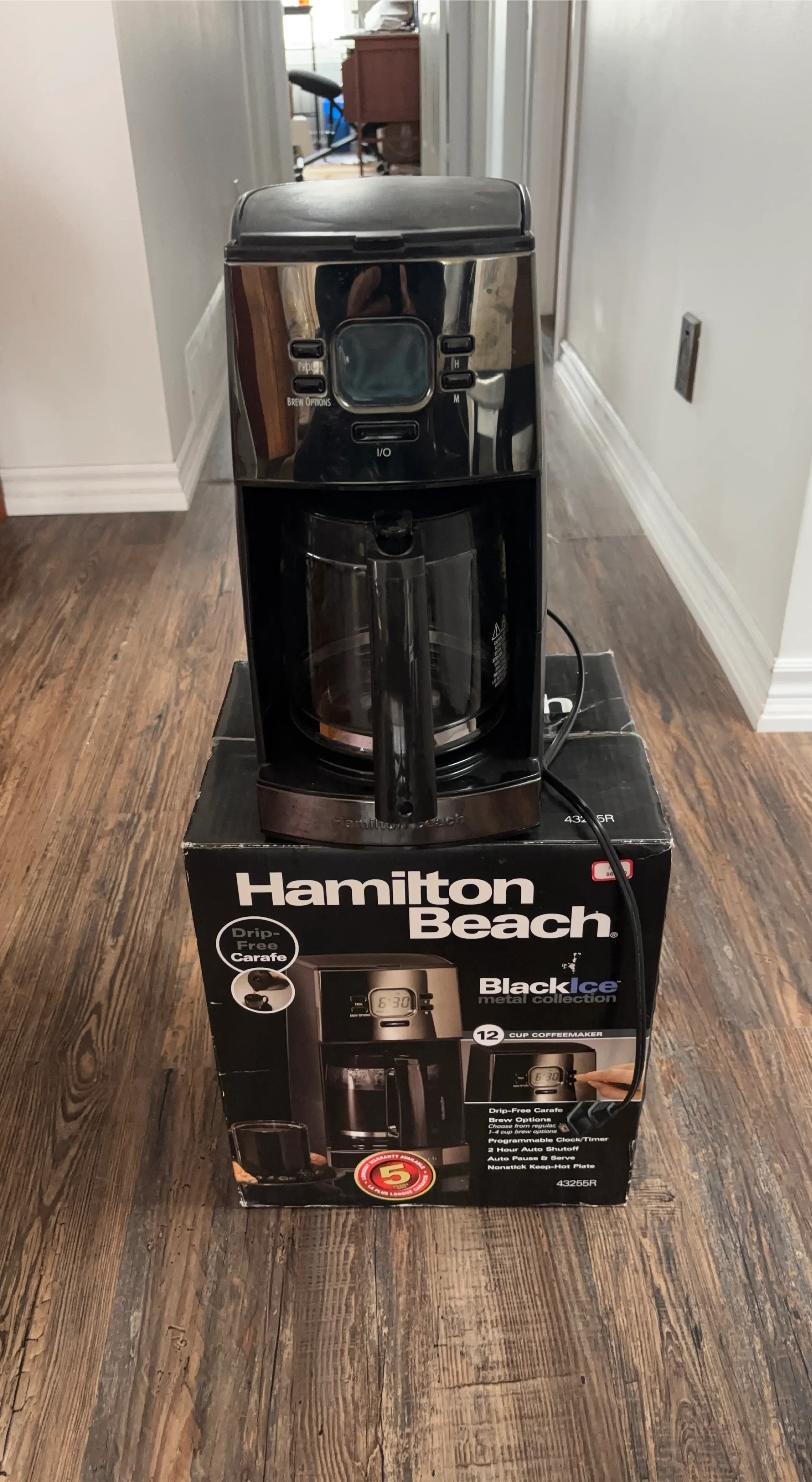 Selling a Hamilton Beach Black Ice metal collection 12-cup coffeemaker! It has a drip-free carafe and brew options to choose from, including regular and 1-4 cup brew options. It also features a programmable clock/timer, a 2-hour auto shutoff, auto pause and serve, and a nonstick keep-hot plate