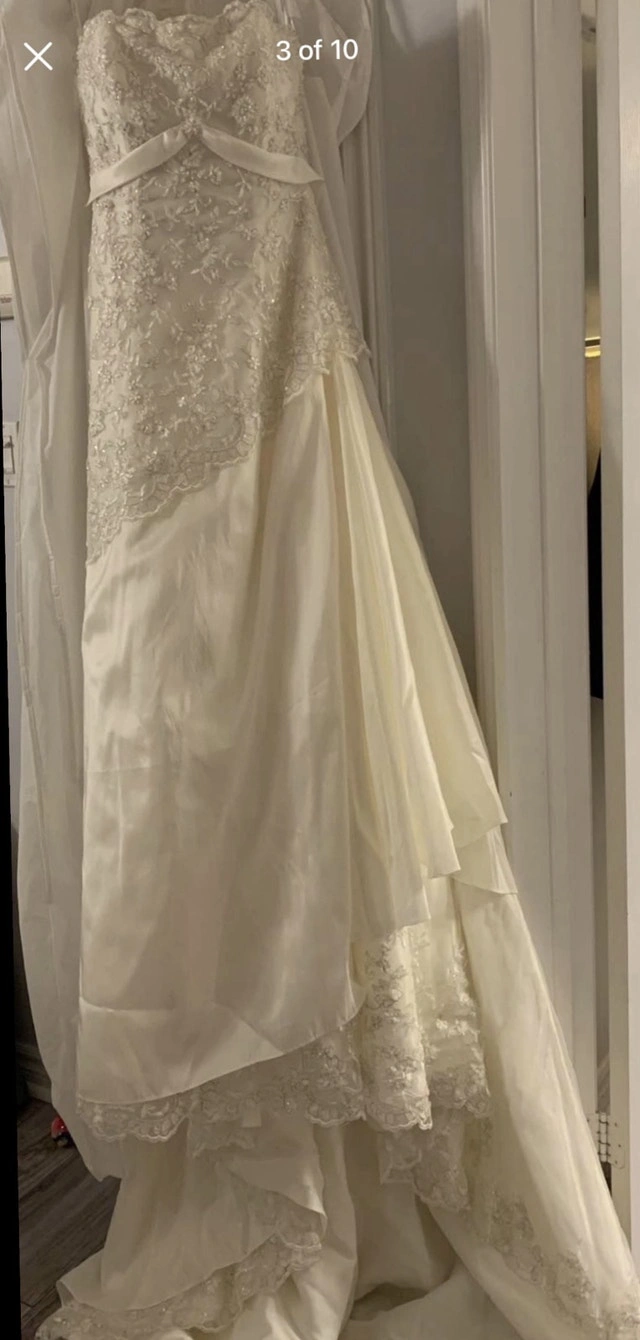 This gorgeous vintage Victorian‑inspired wedding gown is perfect for a bride who wants timeless elegance with a touch of romantic charm. It has never been worn and still has the original tag attached, making it a rare find for anyone seeking a pristine dress with vintage character. Key Features • Size 10 with a flattering Victorian silhouette • Off‑white/ivory shade for a soft, classic bridal look • Removable straps for two beautiful styles: strapped or strapless • Delicate lace and vintage‑style detailing throughout • Brand‑new condition — never worn, tag still on (never worn/ never altered) Condition Brand new with tag. Stored carefully in a smoke‑free home. Price $400 obo Located in Burlington, Ontario. Local pickup preferred; meet‑up options possibly available.