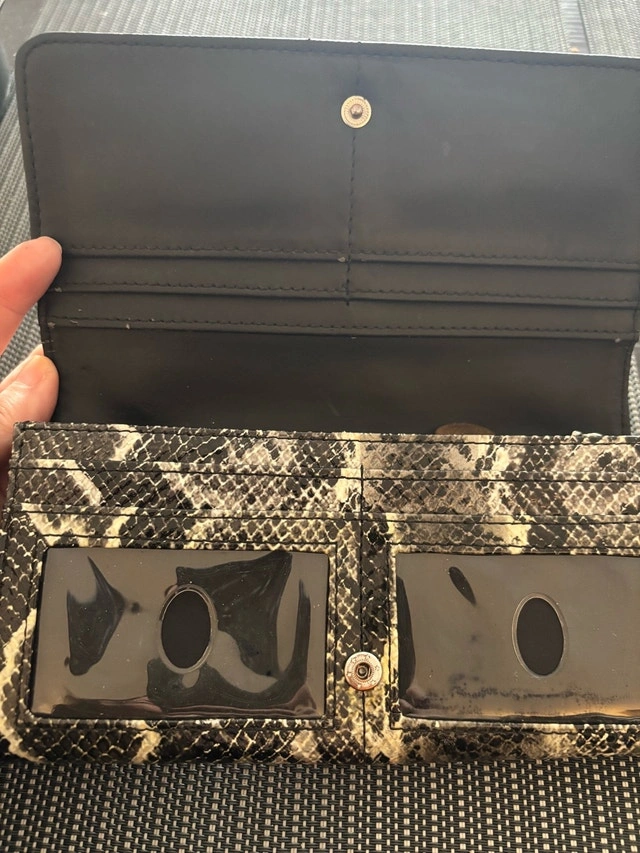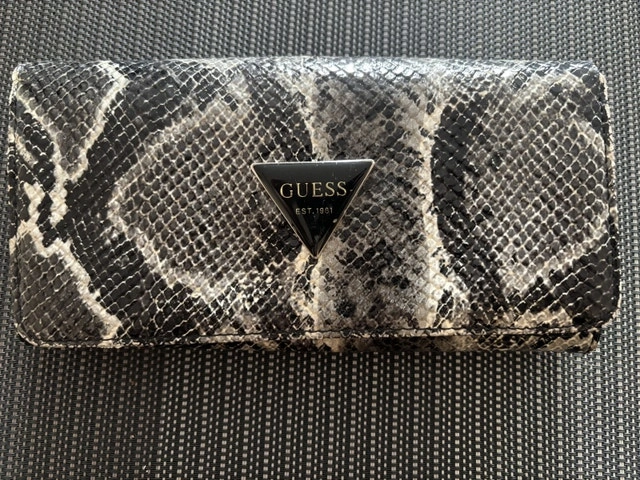 Black-and-white snakeskin wallet from GUESS. Featuring the iconic triangle logo and gold detailing, it’s the perfect blend of fashion and practicality. ✨ Features: