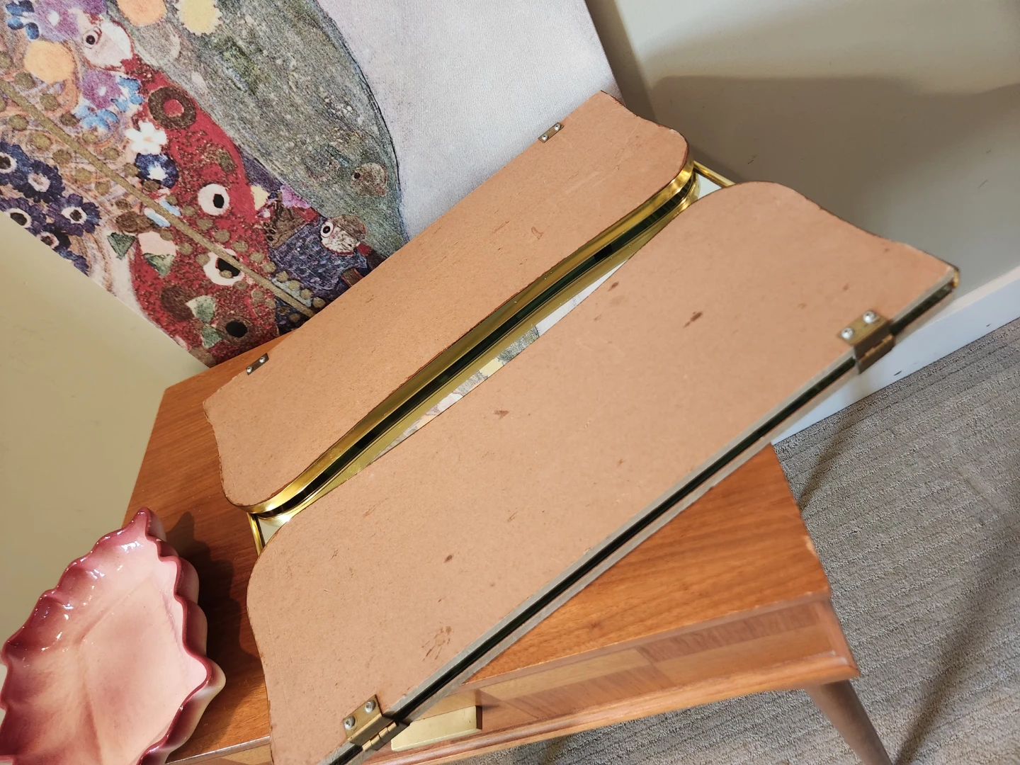 RARE 1940's tri-fold vanity mirror! It's in great shape and perfect for a dressing table or bathroom. This pretty and practical mirror has hooks for wall mounting. Its Gold-tone frame adds elegant decorative mid Century modern style to any space. This mirror folds up for easy storage, packing, moving or travel. Adds a touch of retro charm to any space. 20 inches high, each of the 2 side mirrors is 20x7.5 inches. Middle mirror is 16 inches wide and 20 inches high.