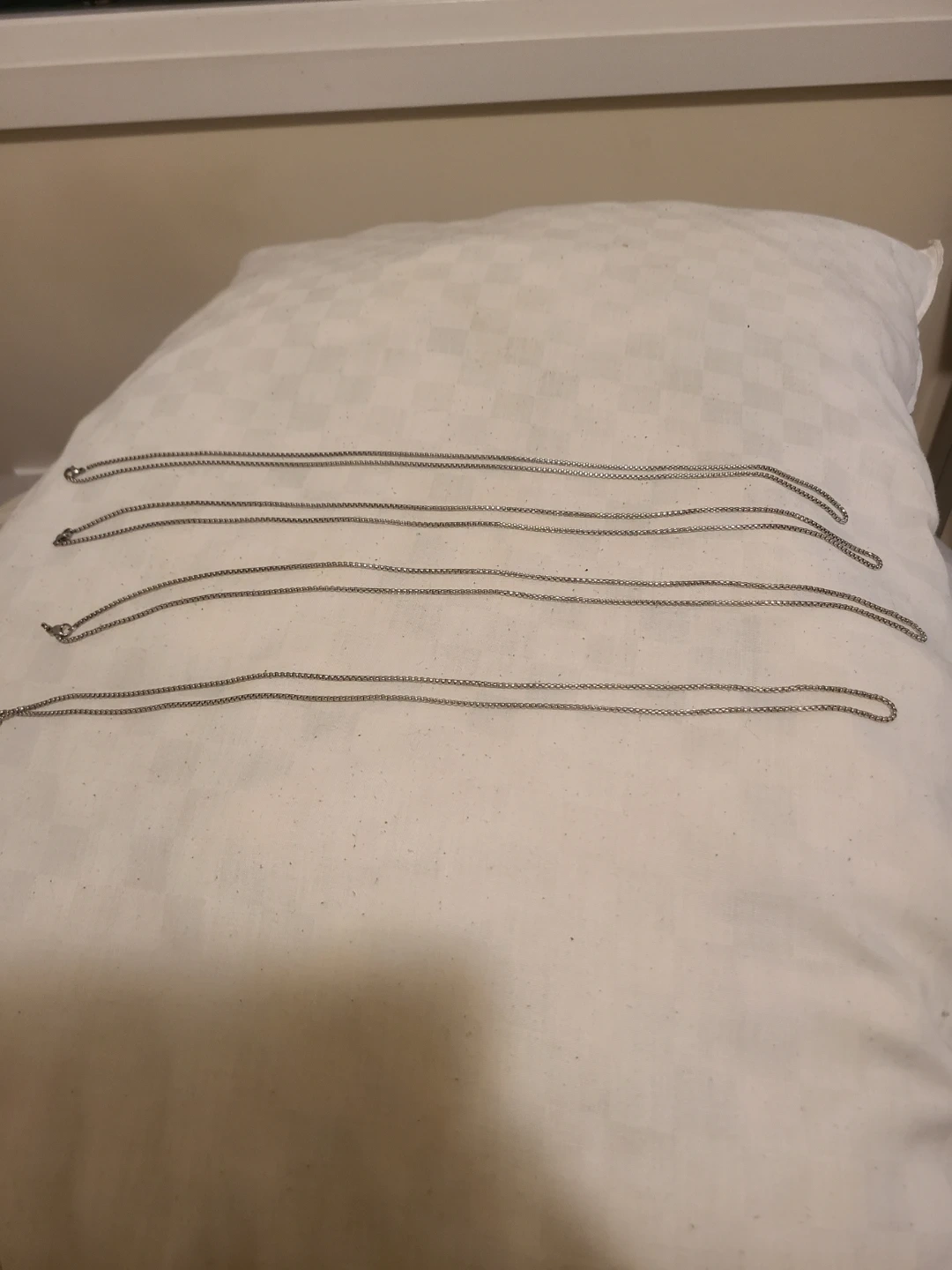 Selling a lot of four silver chain necklaces. They appear to be in good condition and ready to wear! Perfect for layering or wearing individually