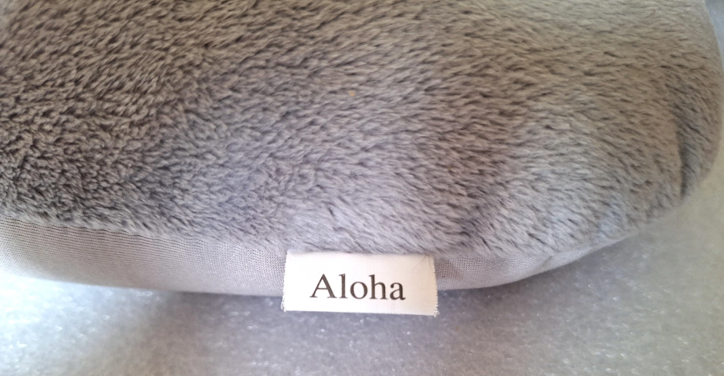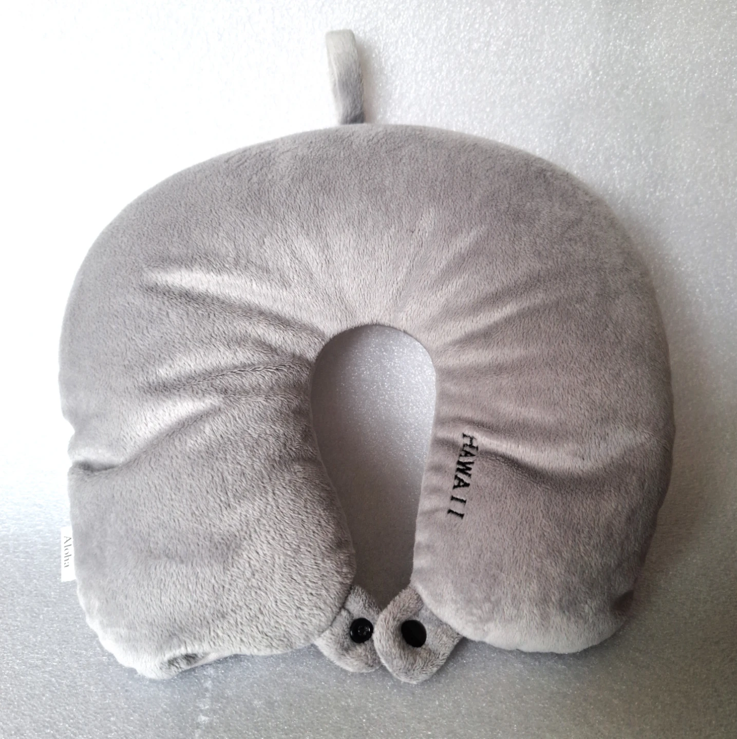 This is a grey neck pillow from Aloha Hawaii. It's super soft and perfect for travel or just relaxing at home. It's in great condition and ready for a new adventure!