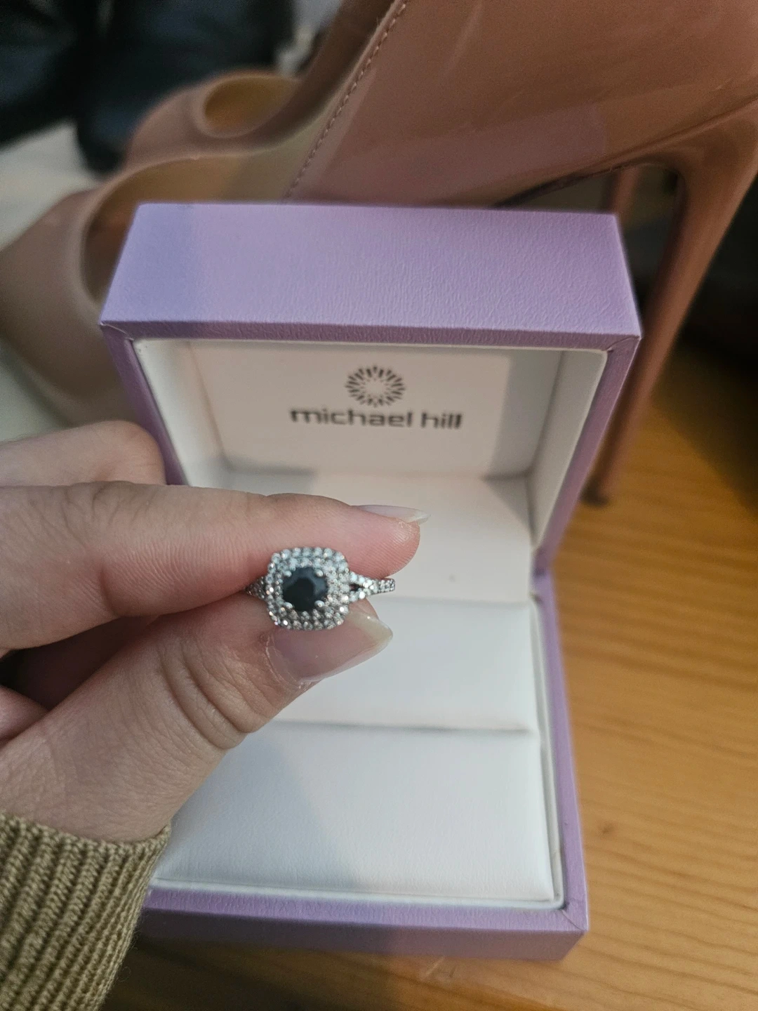 Selling a beautiful ring from Michael Hill. It features a blue sapphire surrounded by smaller diamonds and some ruby rose. All natural. Comes with the original box!