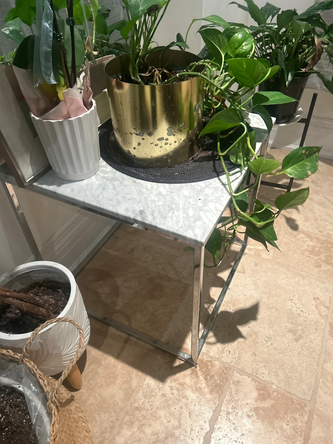 Selling a side table with a marble top and chrome frame. It's in good condition and would be a stylish addition to any room