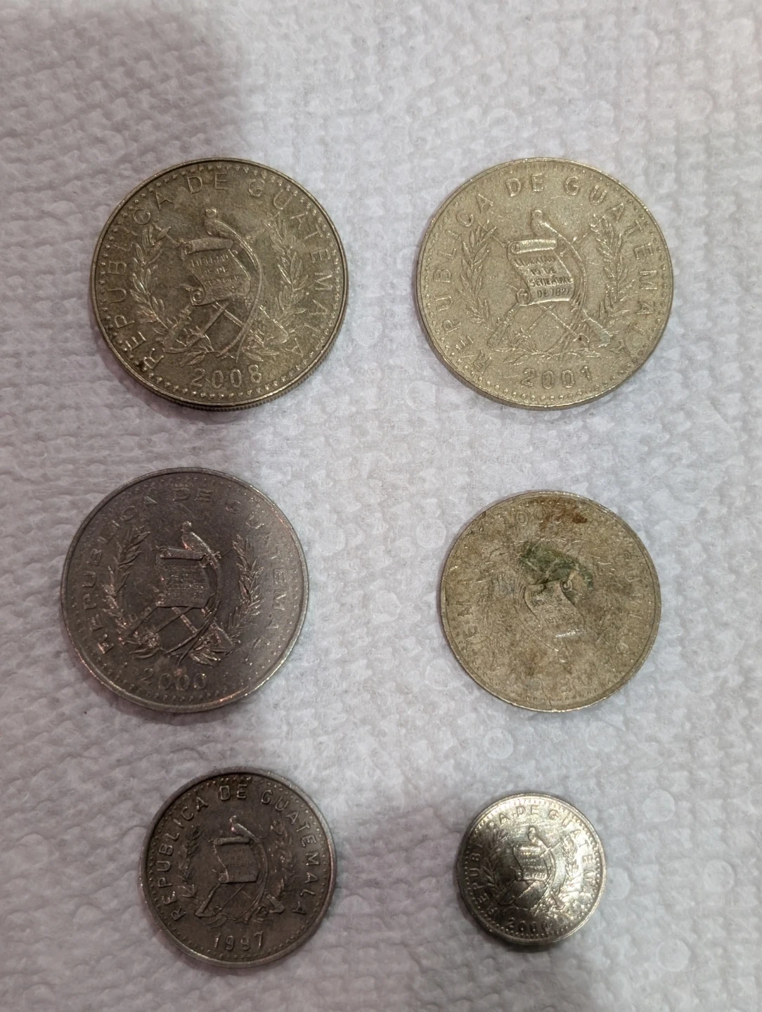 Selling a set of Guatemalan coins. They show various dates and denominations. Perfect for collectors or anyone interested in Guatemalan currency. 6 coin 2008, 2001, 2000, 2007, 1997, 2000. Two coin 1 Quetzal, 25 centavos, 10 centavos,50 centavos, and 5 centavos.