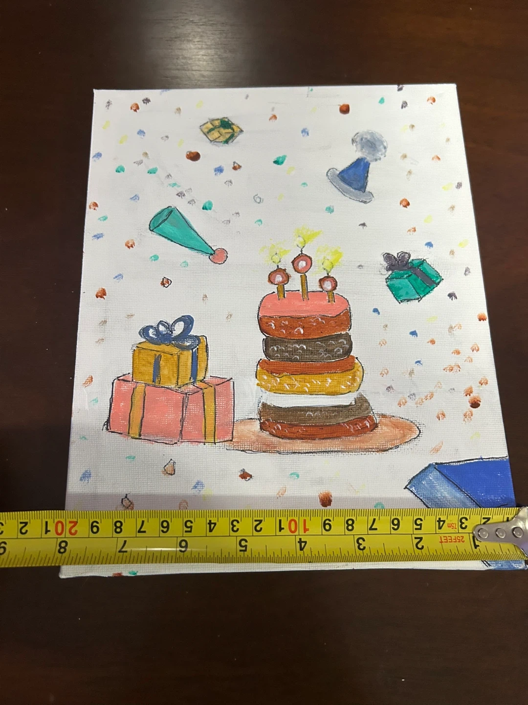 8x10inch acrylic painting of a donut cake and presents for a celebration! Cash or e-transfer only. Sorry no refunds/returns. Payment to be made at pick up. Pick up place is A&W at 200 st Langley. If item needs to shipped, customer is to pay for shipping.