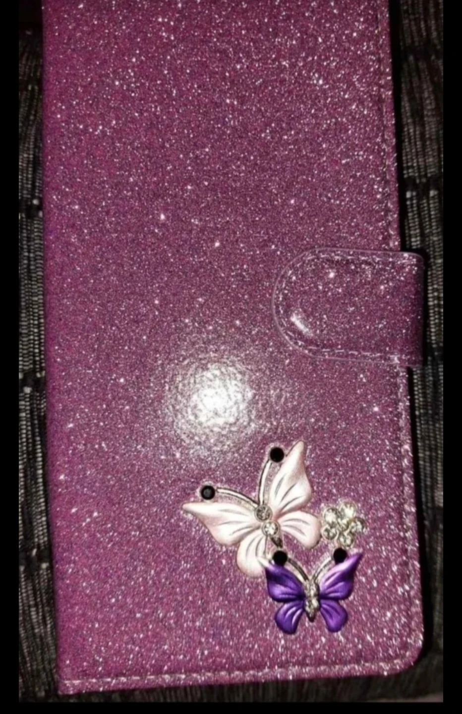 Selling a cute purple glitter phone case for a Samsung A53! It has a magnetic closure and slots for cards. The case also features a butterfly design. Never been used.