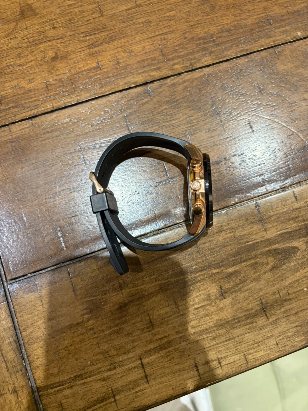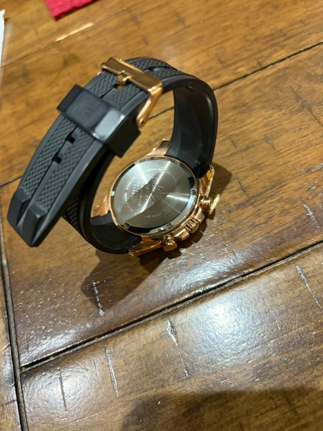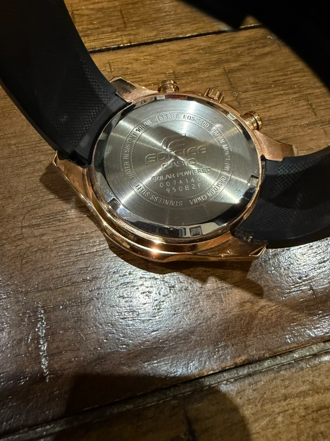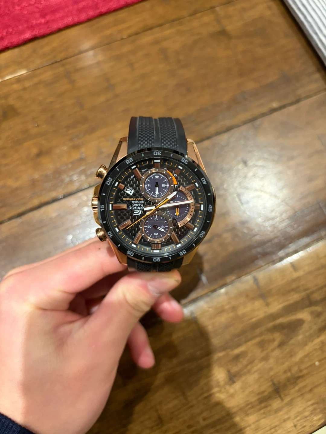 Selling a Casio Edifice solar-powered watch. It features a sleek design and is in great condition. The watch has a black band and a rose gold-tone case. It's a stylish and functional timepiece!