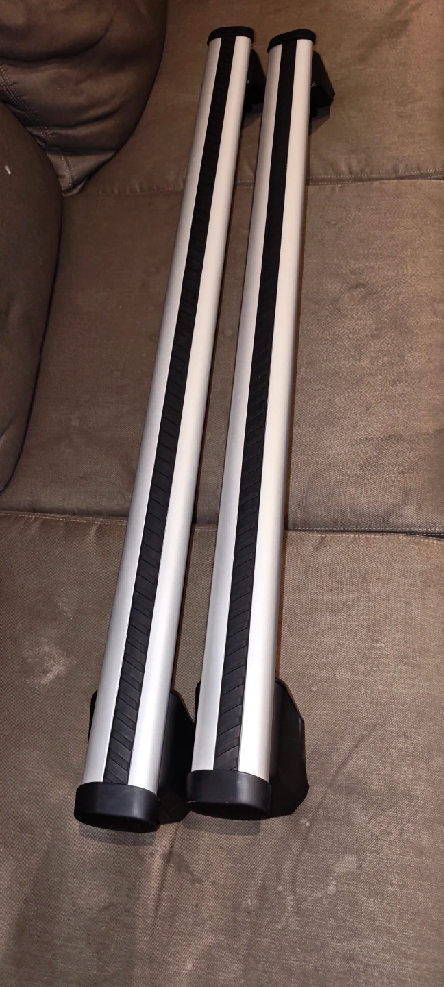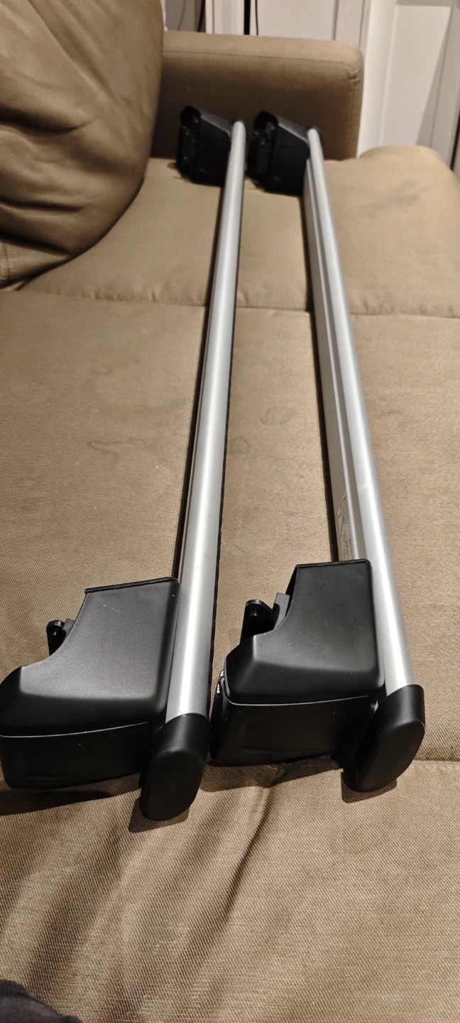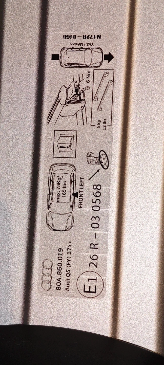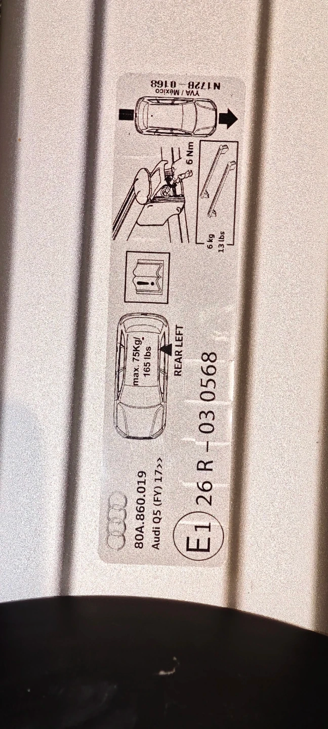 Selling a pair of roof racks for an Audi Q5 (FY 17>). They are silver in colour and in great condition. The label on the rack shows the following information: