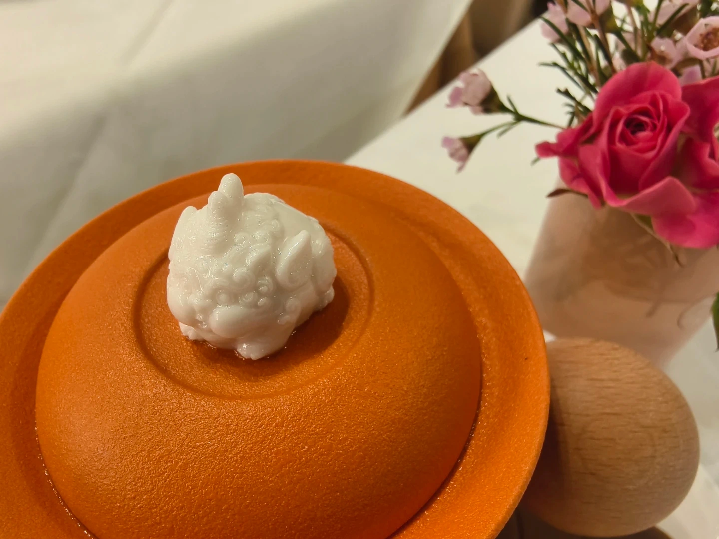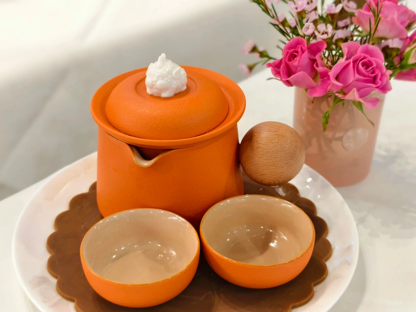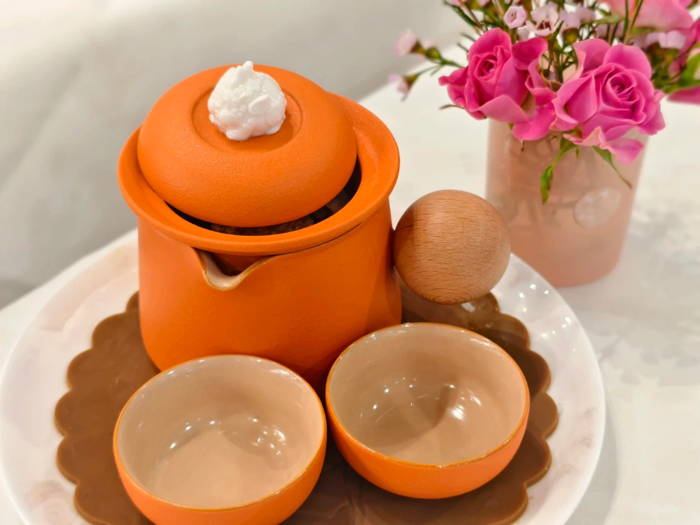 Here's a charming tea set featuring an orange teapot and two matching cups! It's perfect for enjoying a cozy tea time at home.