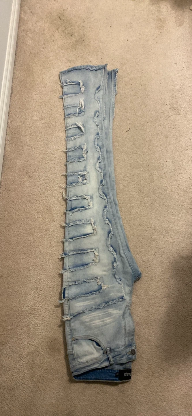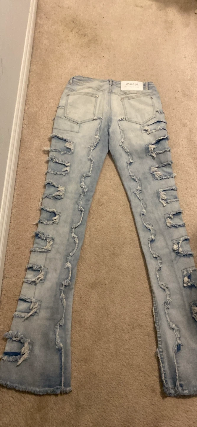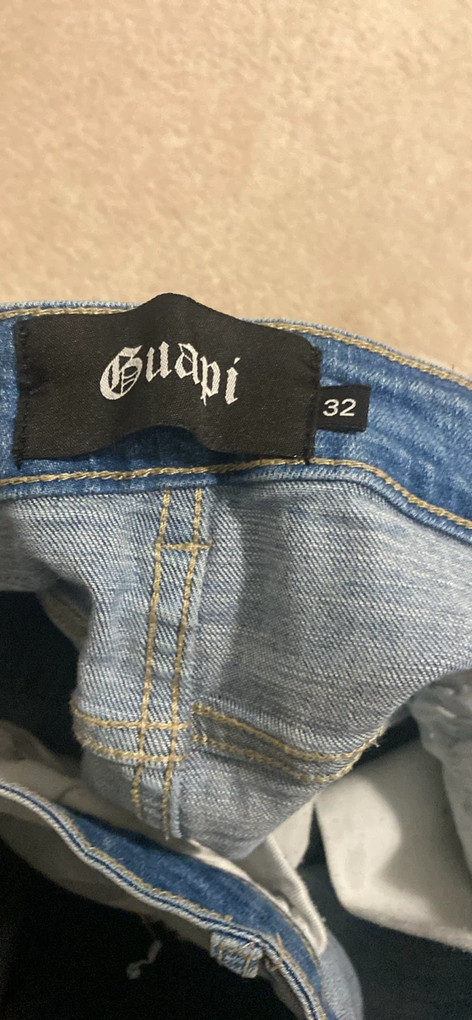 Selling a pair of Guapi designer denim jeans in size 32. These jeans feature a unique, distressed design with cutouts and a light wash. They're in great condition and ready for a new owner!