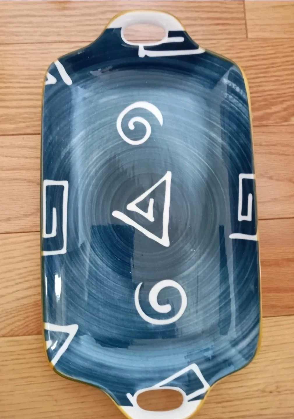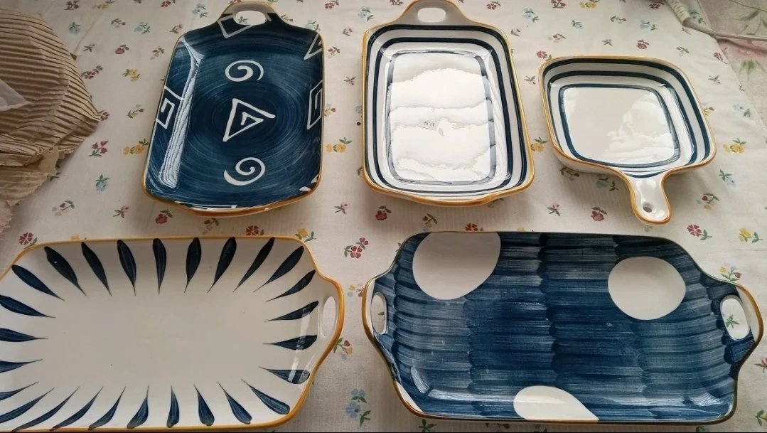 Selling a set of decorative serving trays. They feature various marble blue and white patterns with a yellow trim. Perfect for adding a touch of style to your kitchen or ideal as a gift.