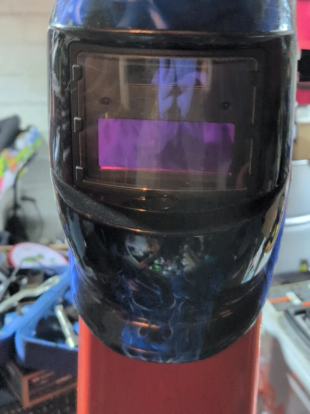 Selling a used welding helmet featuring a cool blue flame design. It's in good condition and ready for your next welding project! It has some signs of use but is still fully functional and reliable