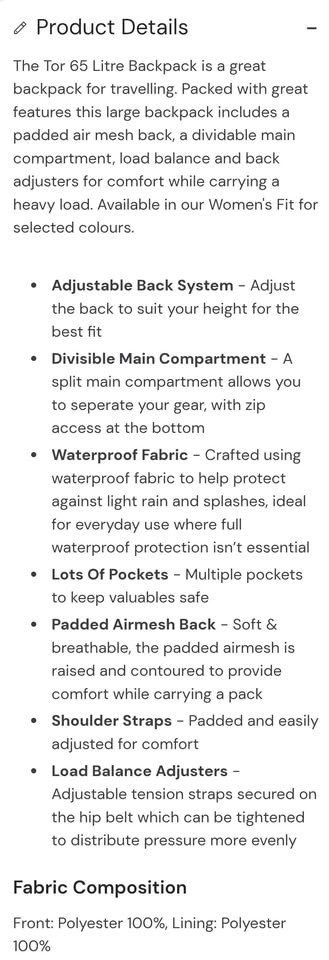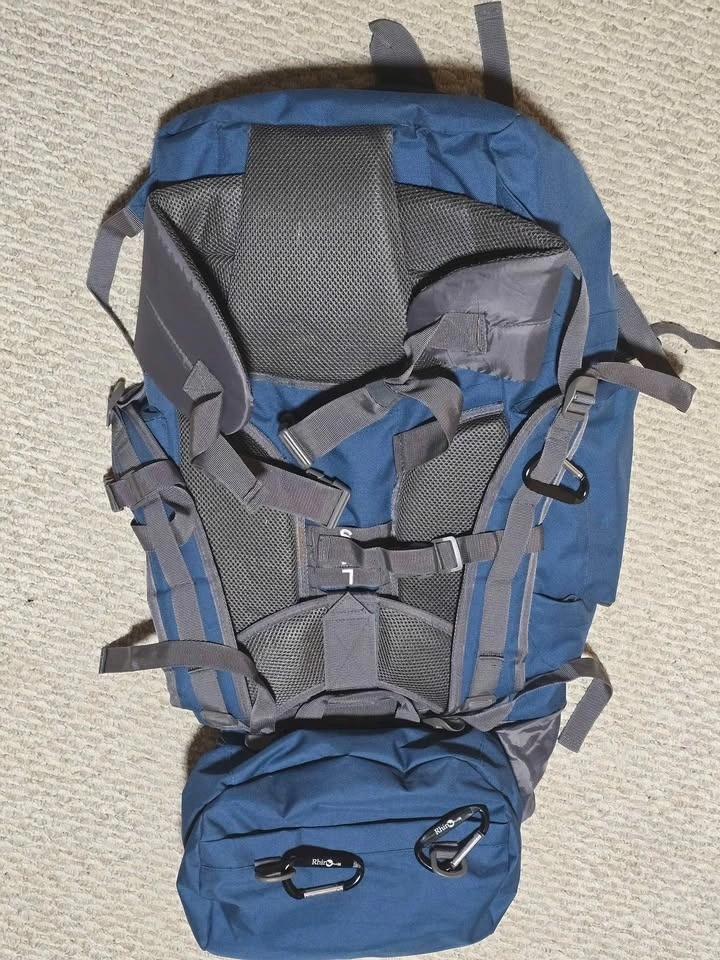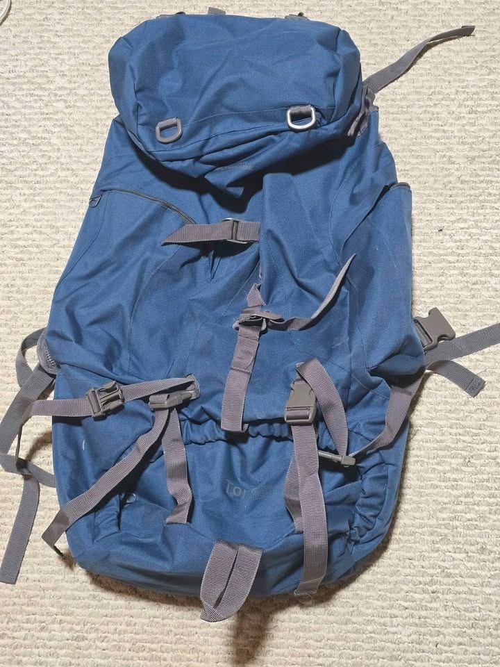 Used once. Navy blue color. 65L capacity. No tears. Like new. Description: This Backpack is a great backpack for travelling. Packed with great features this large backpack includes a padded air mesh back, a dividable main compartment, load balance and back adjusters for comfort while carrying a heavy load.