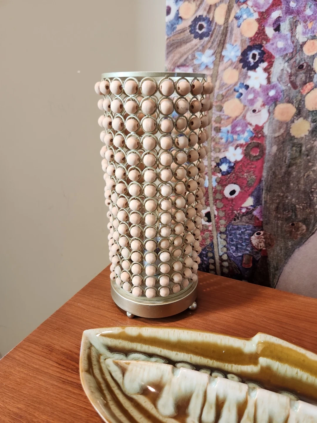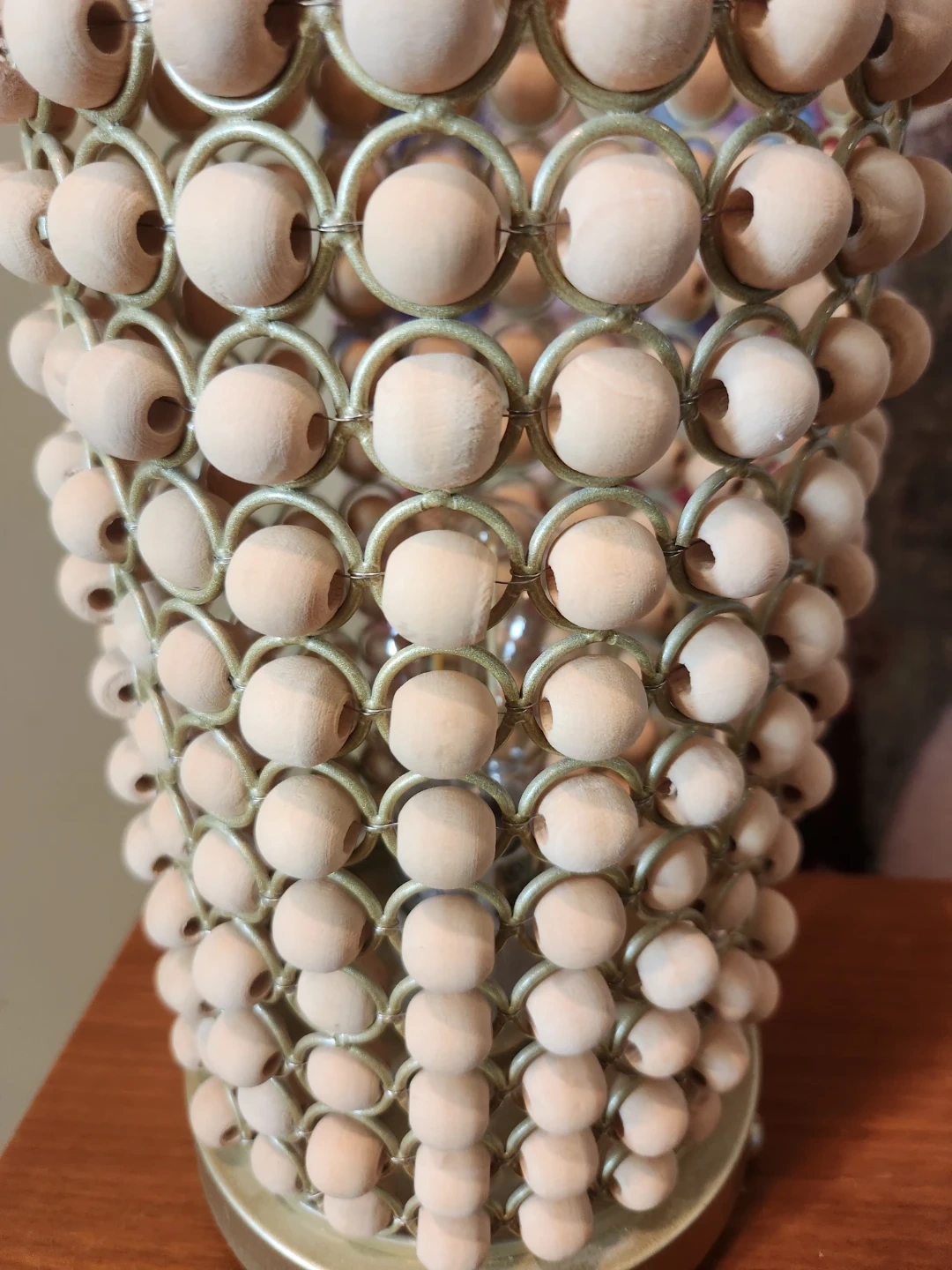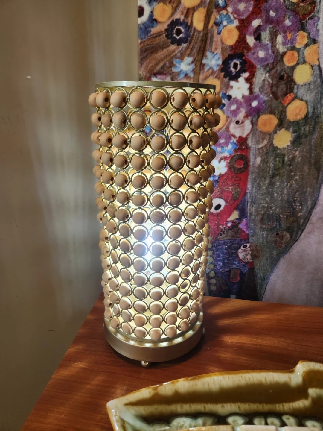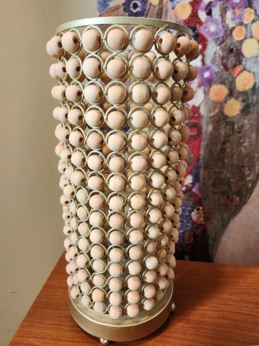 BOHO BOUTIQUE ALERT Add a unique touch to your space with this decorative table lamp! It features a metal frame adorned with natural wood beads, creating a warm and inviting glow. Perfect for a bedside table or living room accent