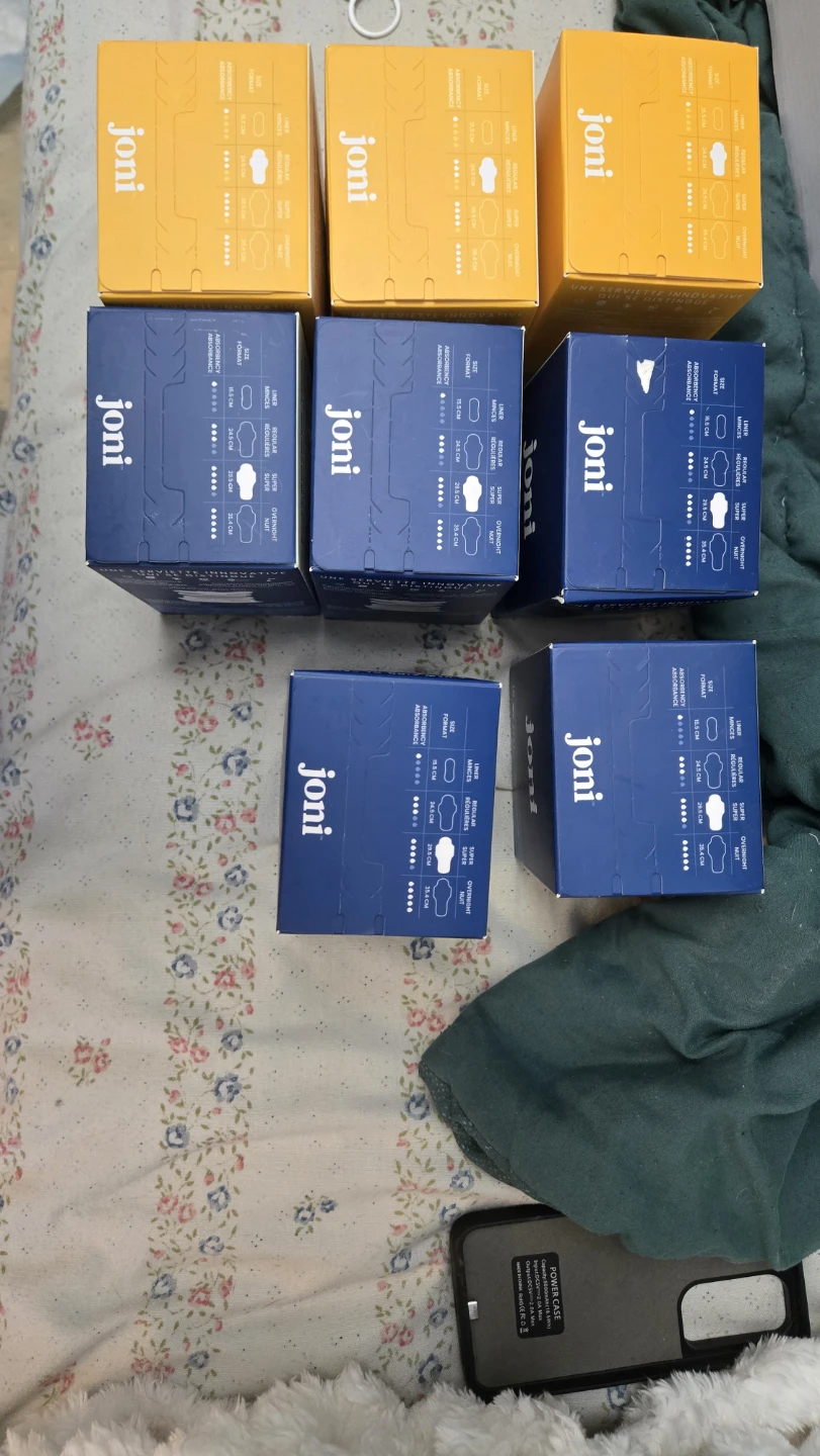 I have several boxes of Joni period products available. There are liners, regular absorbency, super absorbency, and overnight pads. Please see the photos for details on sizes and absorbency.