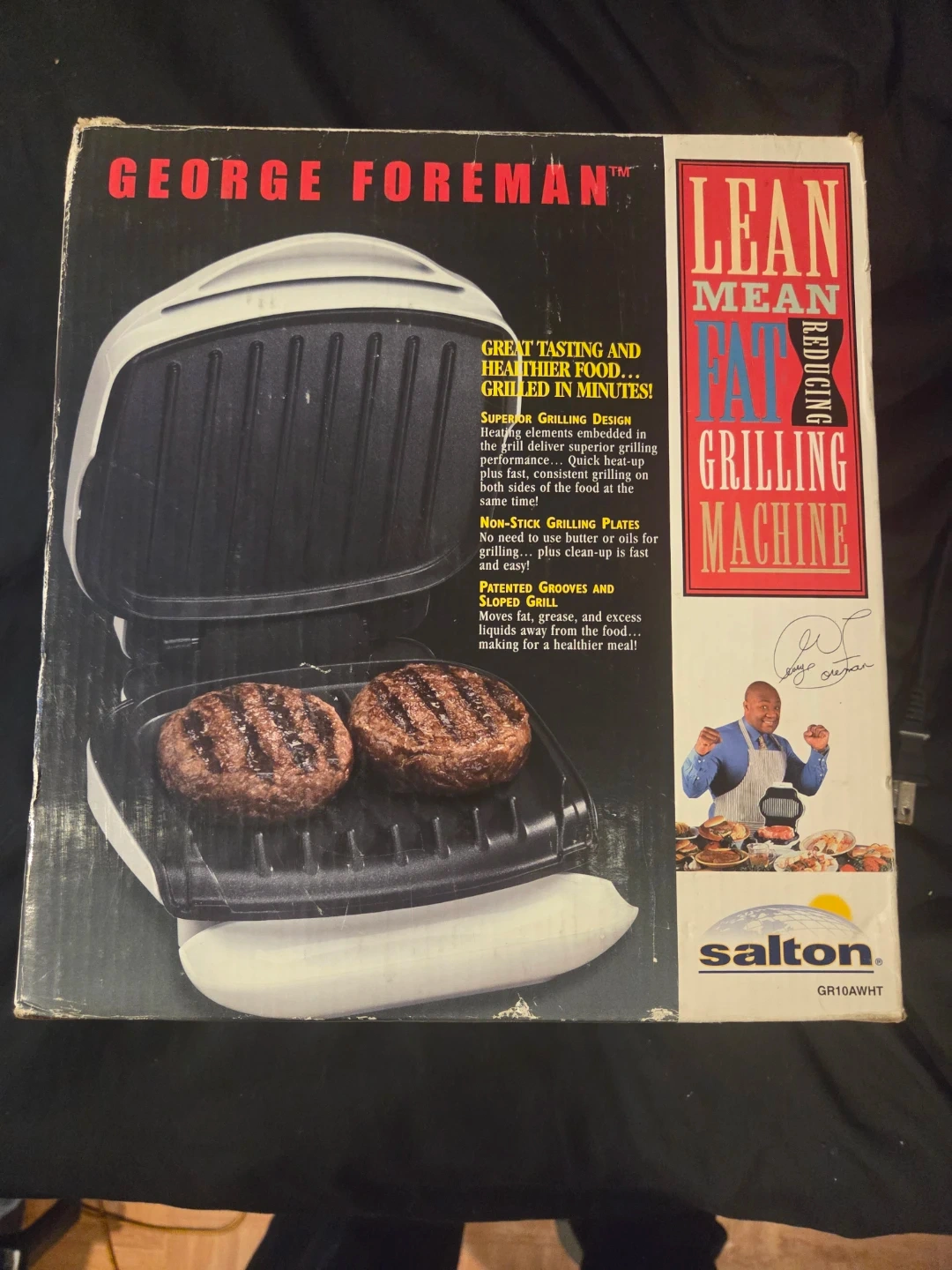 Selling a George Foreman Lean Mean Fat Reducing Grilling Machine. It has superior grilling design with heating elements embedded in the plates for quick heat-up and even cooking. The non-stick grilling plates mean no need to use butter or oils for cooking, and clean-up is easy. It also moves fat, grease, and excess oils away from your food making for a healthier meal. Model number GR10AWT