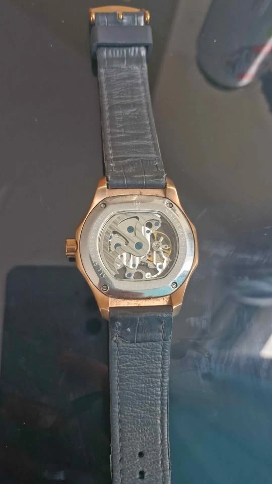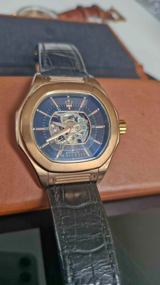 Selling a Maserati automatic watch. It features a distinctive design with a visible mechanical movement and a leather strap. The watch has a gold-tone case and a blue dial.