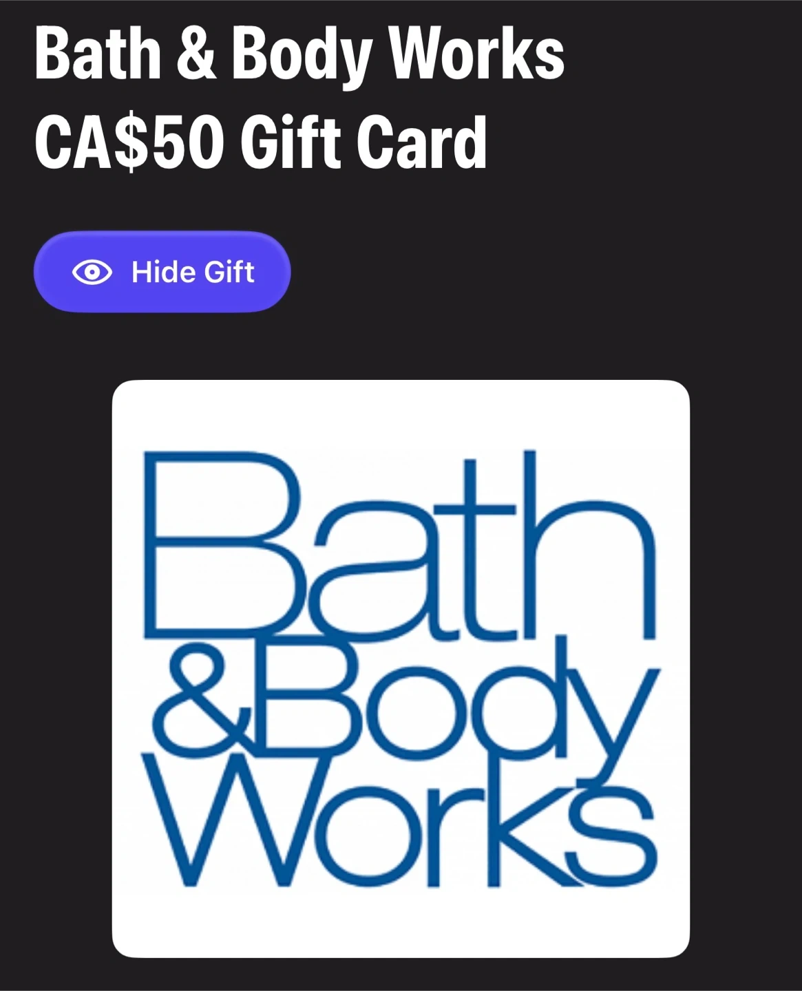 Selling a Bath & Body Works digital gift card with a value of $50 CA. Perfect for treating yourself or gifting to someone special!