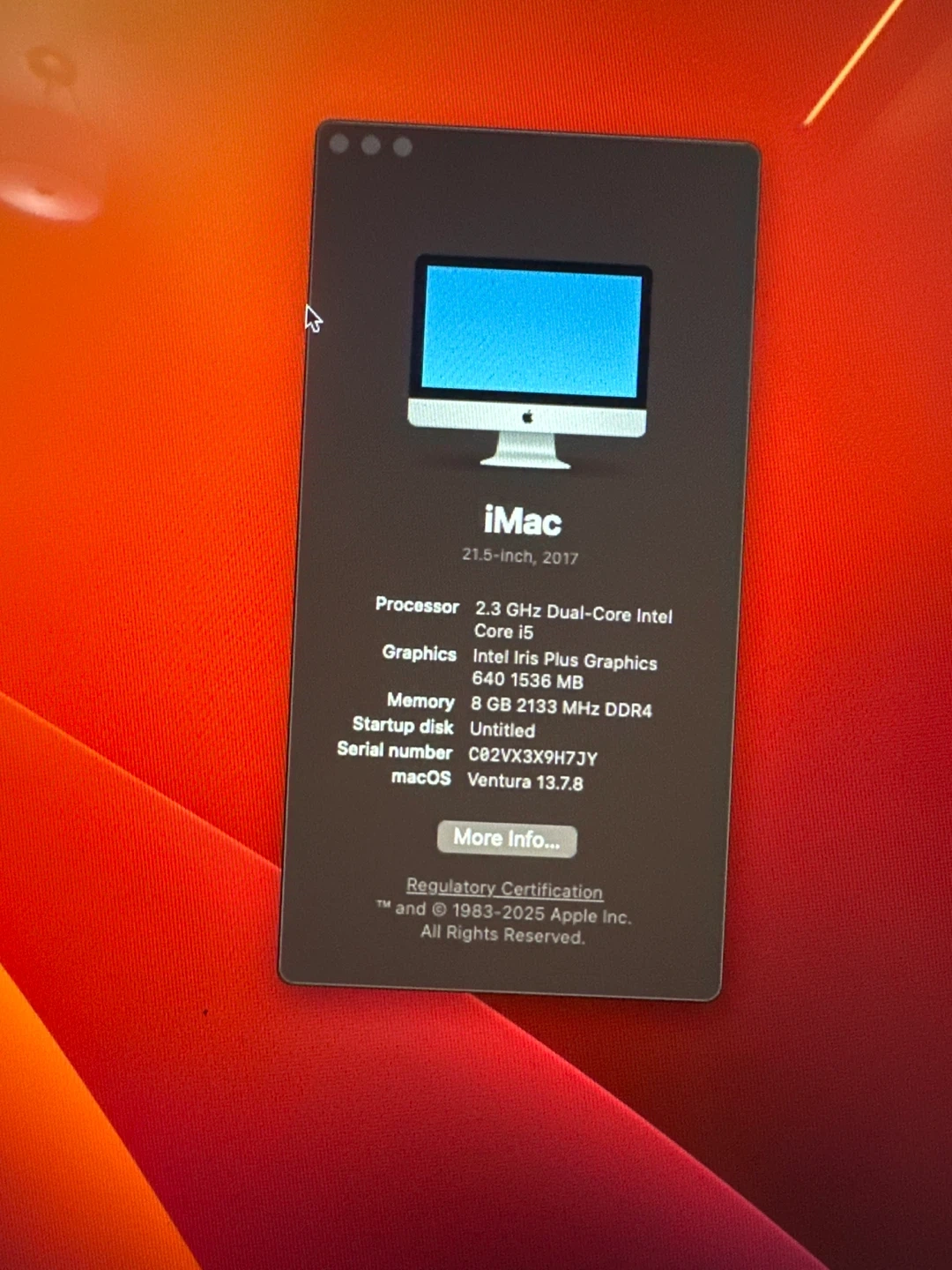 Selling a used iMac 21.5-inch from 2017. It has a 2.3 GHz Dual-Core Intel Core i5 processor, Intel Iris Plus Graphics 640 1536 MB graphics, and 8 GB 2133 MHz DDR4 memory. Runs on macOS Ventura 13.7.8