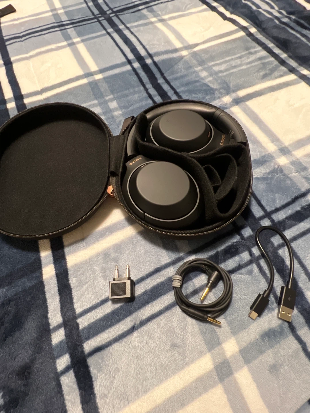 Selling Sony WH-1000XM4 wireless headphones in black. They are in great condition and come with the original carrying case, adapter, and cables. Perfect for enjoying your favourite tunes on the go!