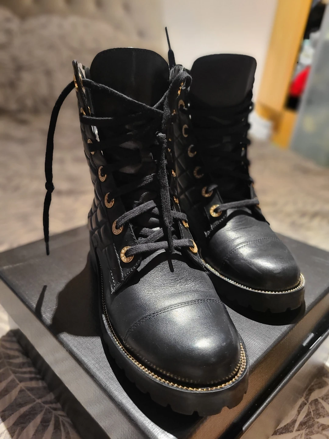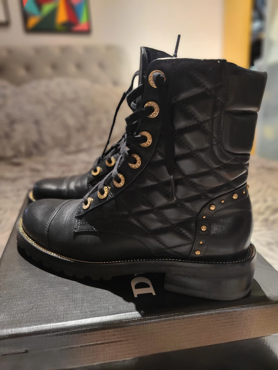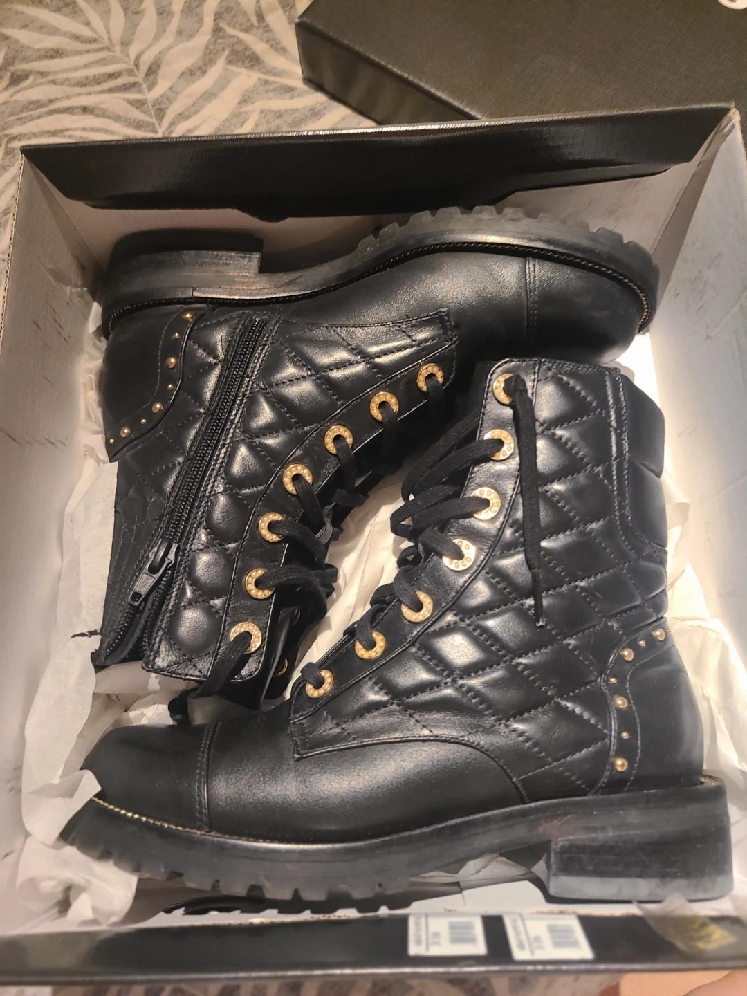 These stylish Dune London boots are in great condition and ready for a new adventure! They feature a lace-up design with gold detailing on a quilted black leather. Comes with the original box