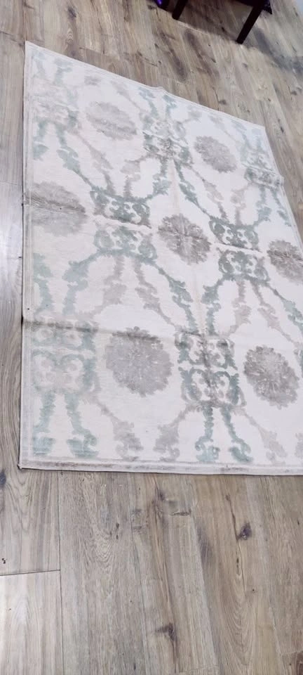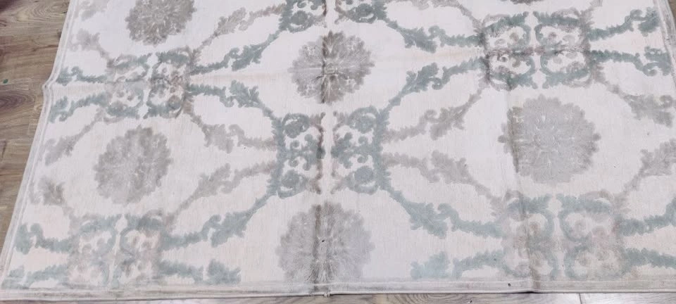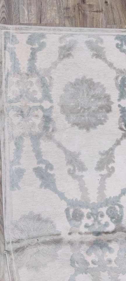 Beautiful decorative area rug featuring a classic floral and vine pattern in soft gray, beige, and light blue tones.