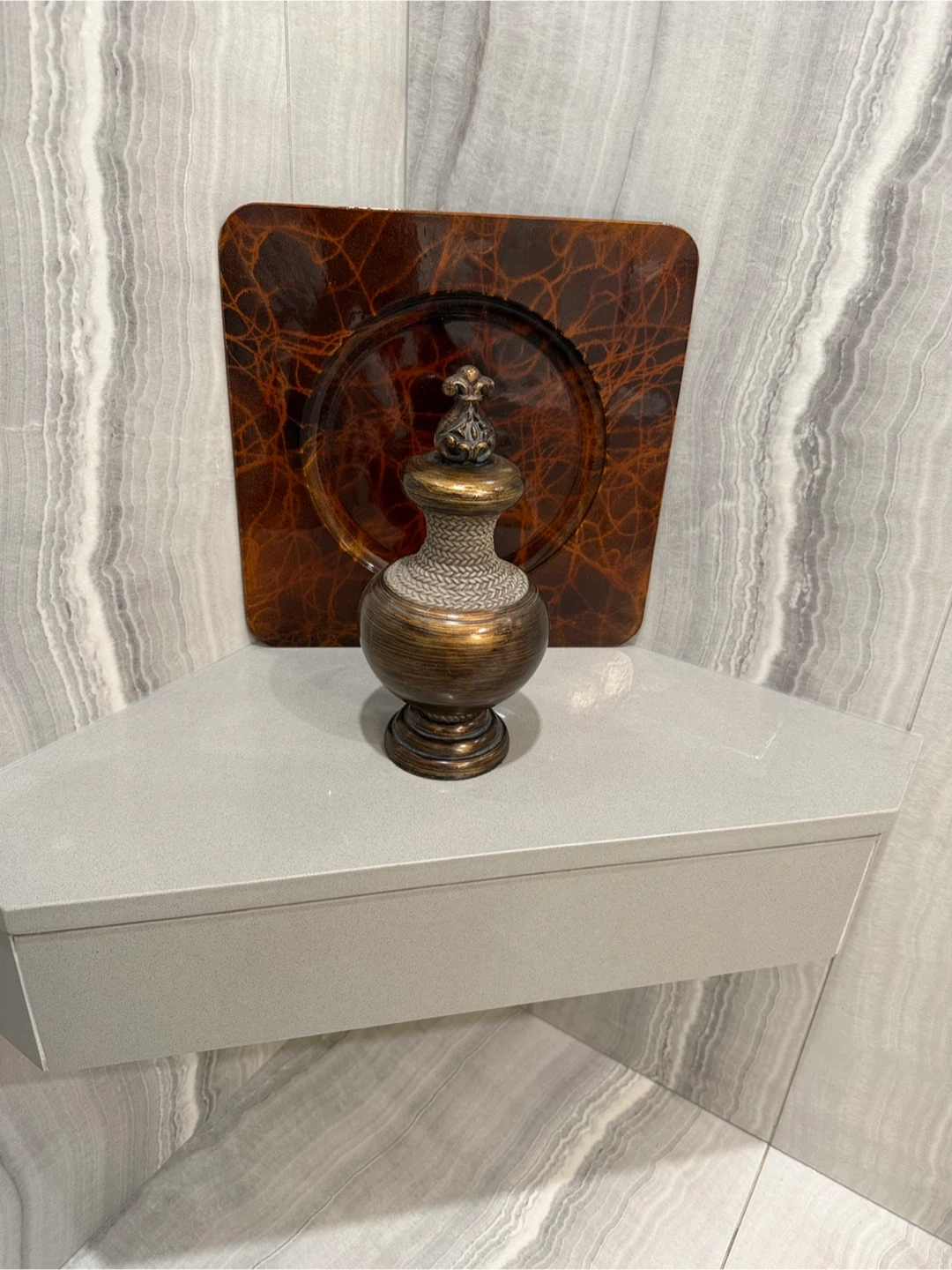 A decorative vase with a brown patterned plate. It's in great condition and would be a lovely addition to any room