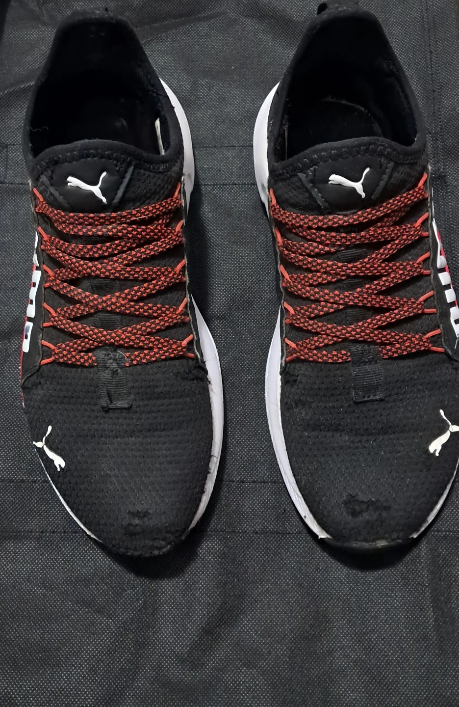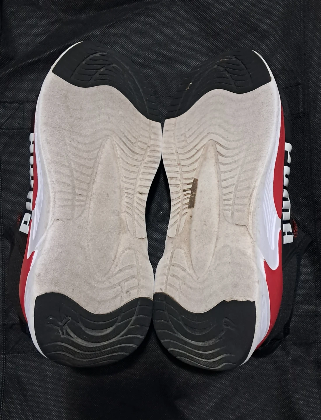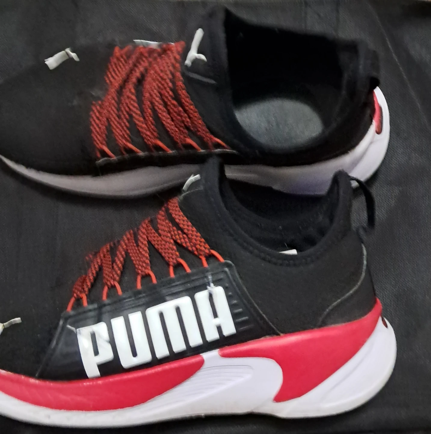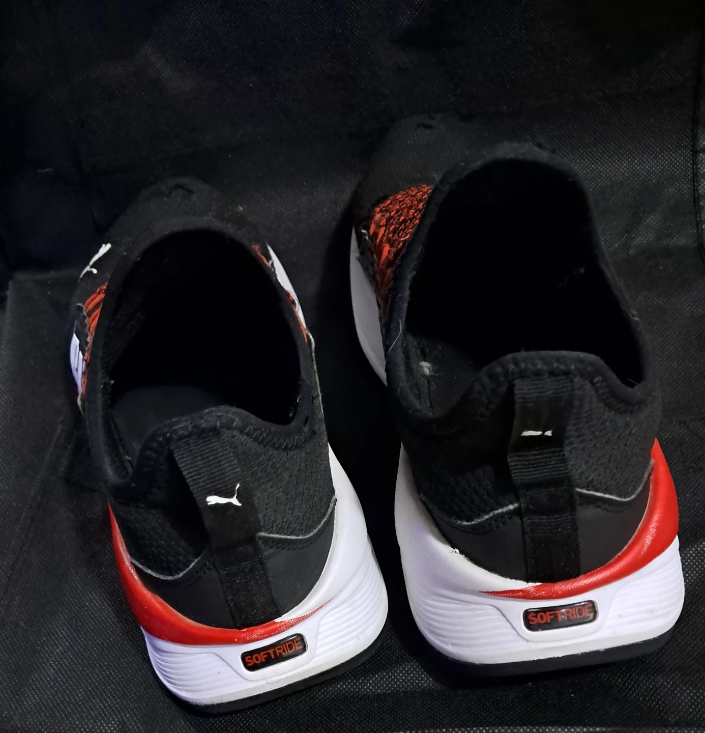 Selling a pair of Puma Sofride running shoes in black and red. They show some signs of wear, but still in good shape with lots of life left. Great for casual wear or running!