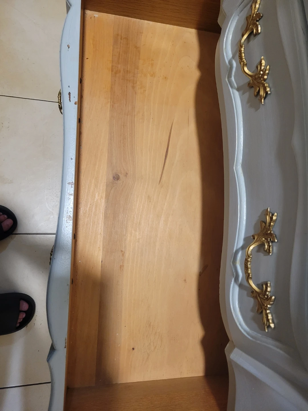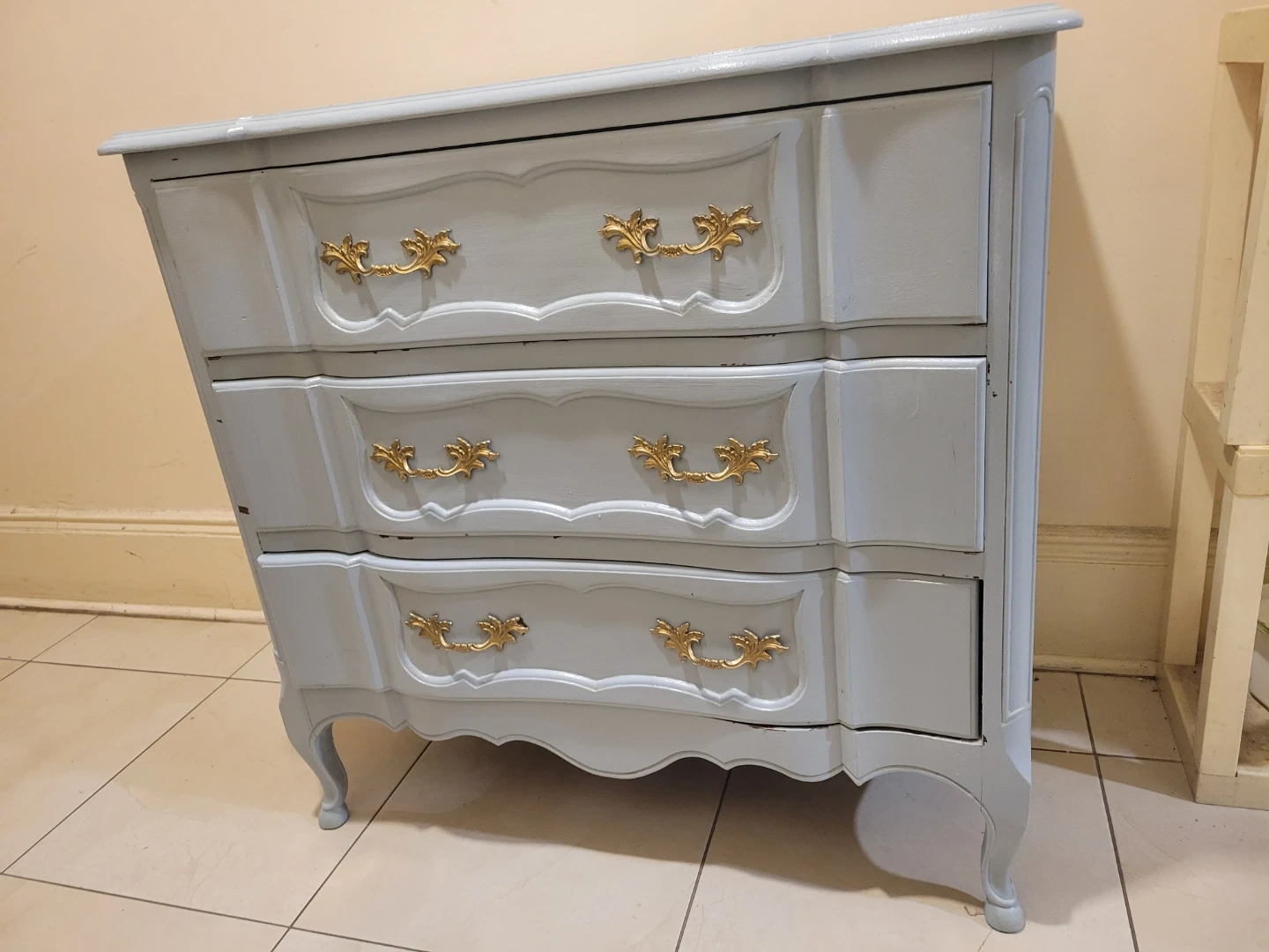 Selling a charming 3-drawer dresser with a light blue painted finish and ornate gold handles. It's a beautiful piece that could add a touch of elegance to any room. There are some signs of wear and tear, but it's still in good condition and ready for a new home. Heavy!