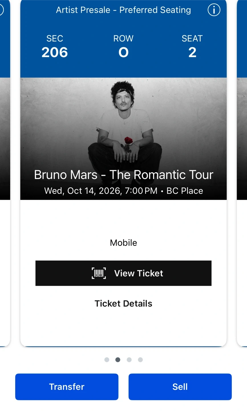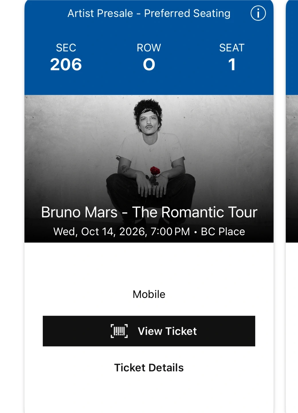 Selling TWO tickets for Bruno Mars' The Romantic Tour at BC Place on Wednesday, October 14, 2026, at 7:00 PM. Preferred seating, Section 206, Row O, Seat 1 & Seat 2