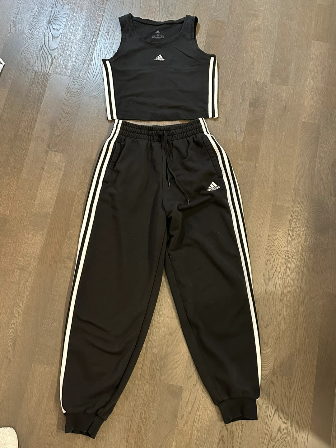 Selling a cute Adidas tracksuit set in size small! The set includes a tank top and matching track pants, both featuring the classic Adidas three-stripe design. Perfect for workouts or just lounging around