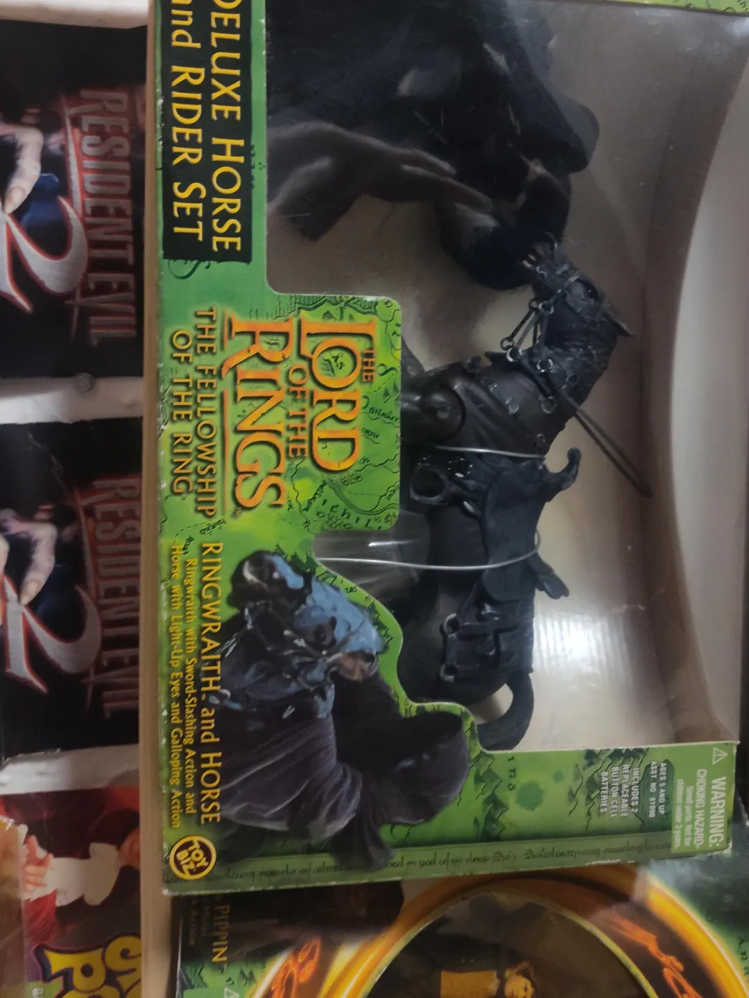 Selling a Lord of the Rings The Fellowship of the Ring Ringwraith and Horse Deluxe Horse and Rider Set. It features Ringwraith with Sword-Slashing Action and Horse with Light-Up Eyes and Galloping Action. Includes 2 replaceable button cell batteries. For ages 5 and up