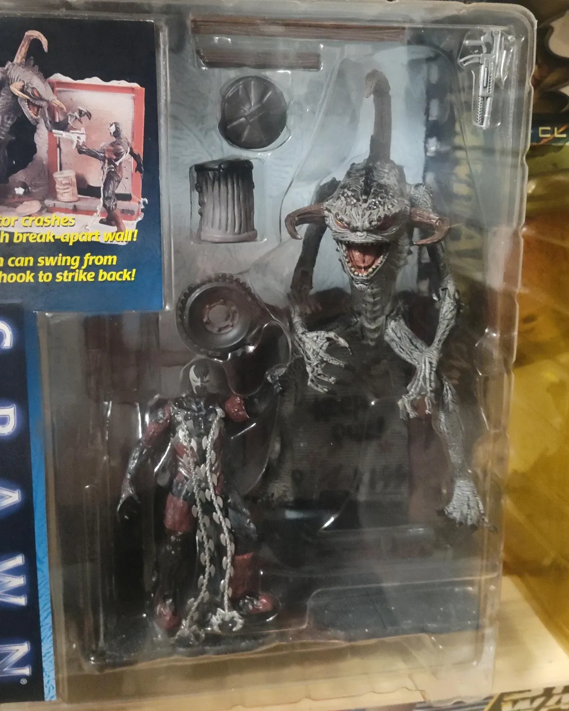 Selling a Spawn action figure set, still in its original packaging! The set includes Spawn and a monster figure, along with accessories like a trash can, a weapon, and a piece of the wall that can break apart. Great for collectors or fans of the Spawn series