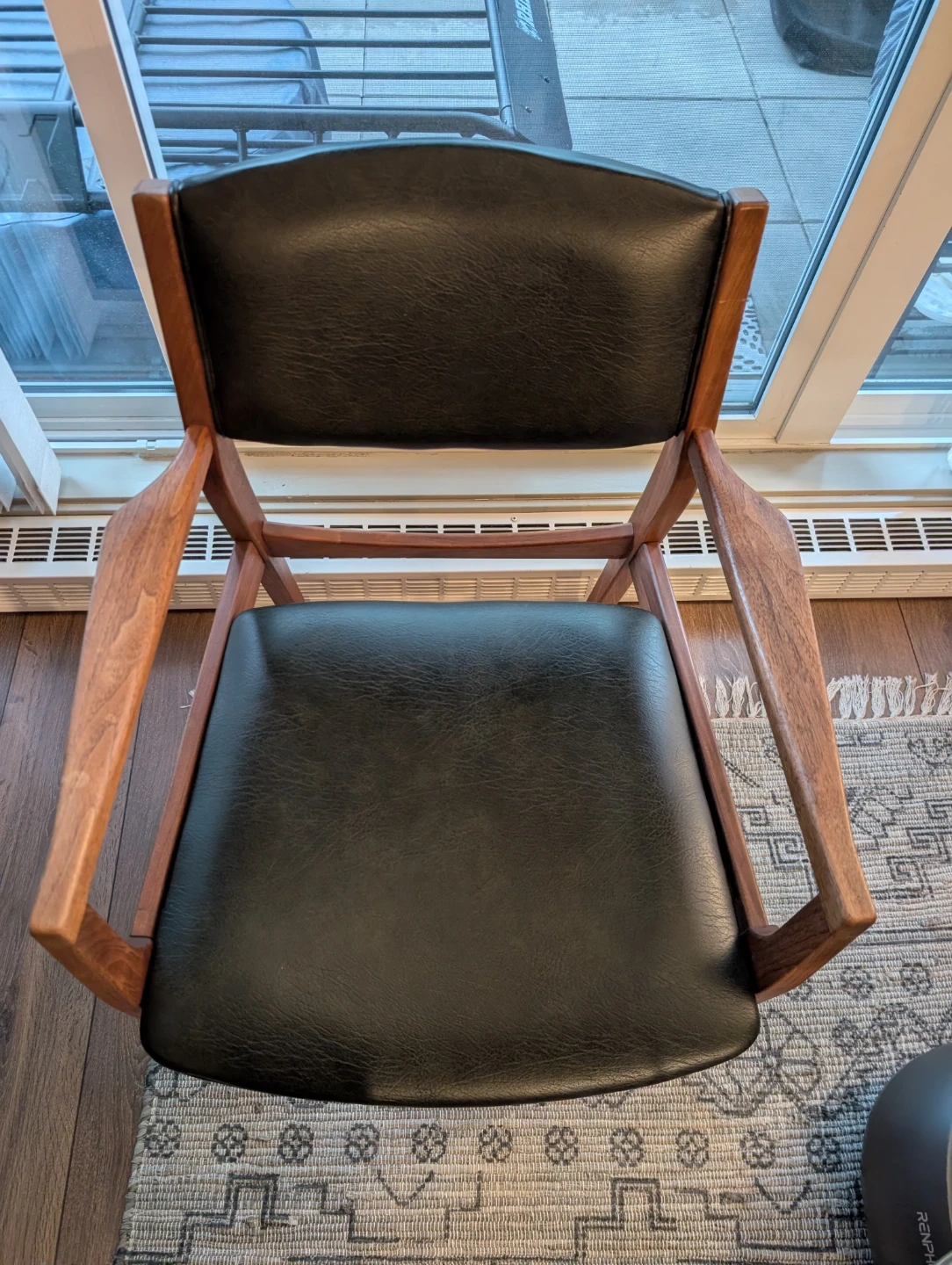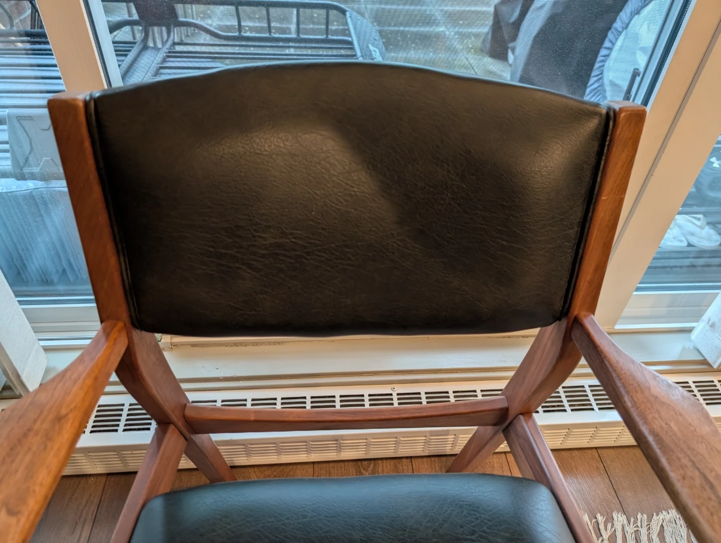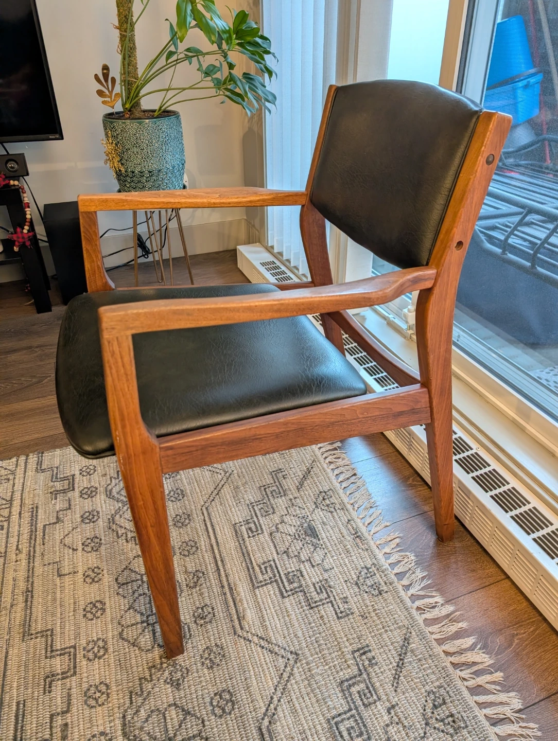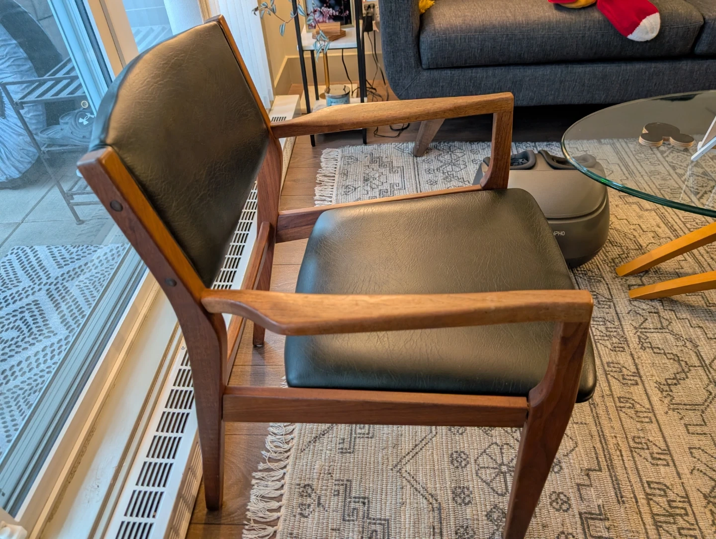 A beautiful accent chair with natural dark green leather. It has been in my possession for 9 years. The chair is in very good condition with a small hairline crack in one of the side panels.