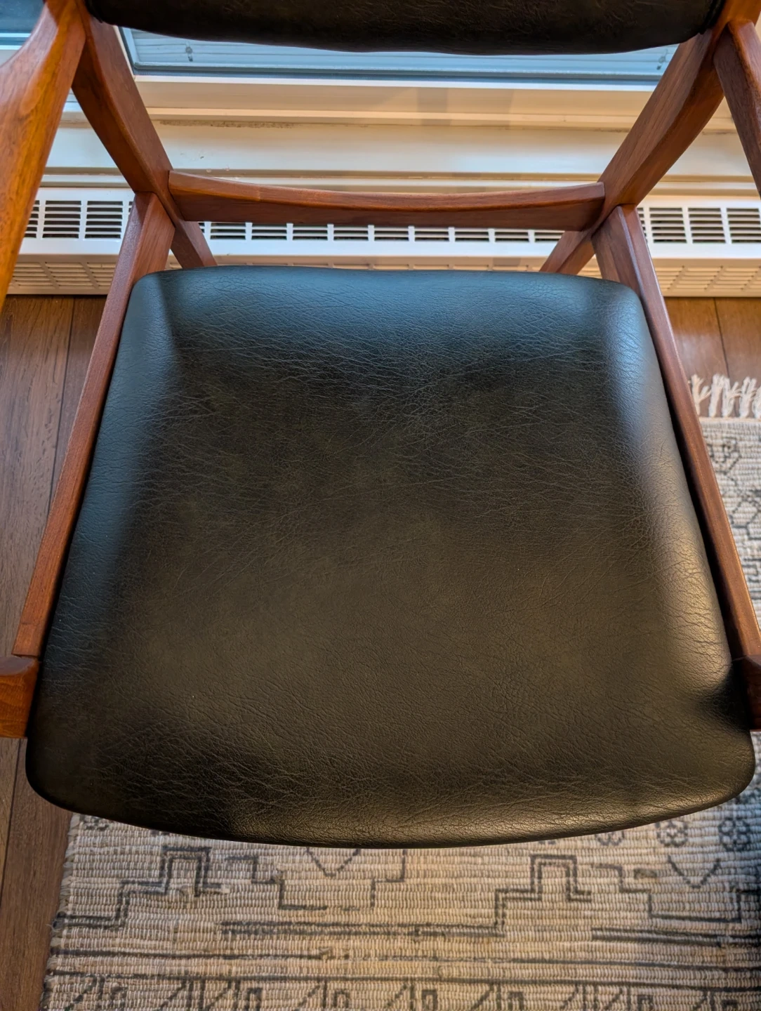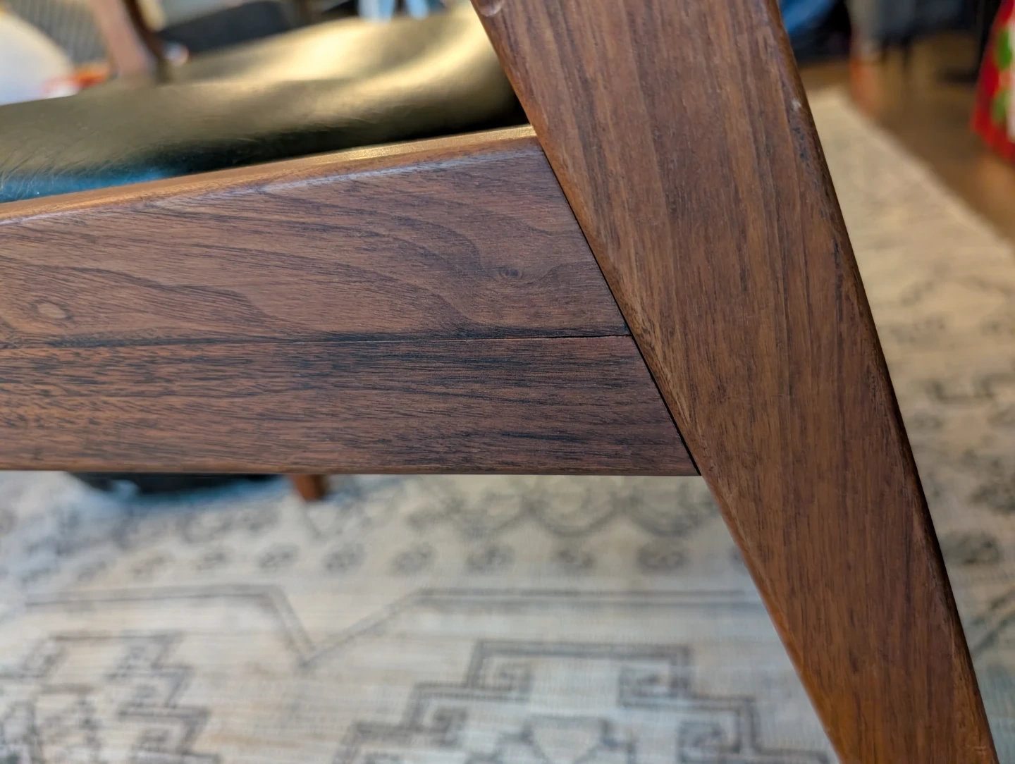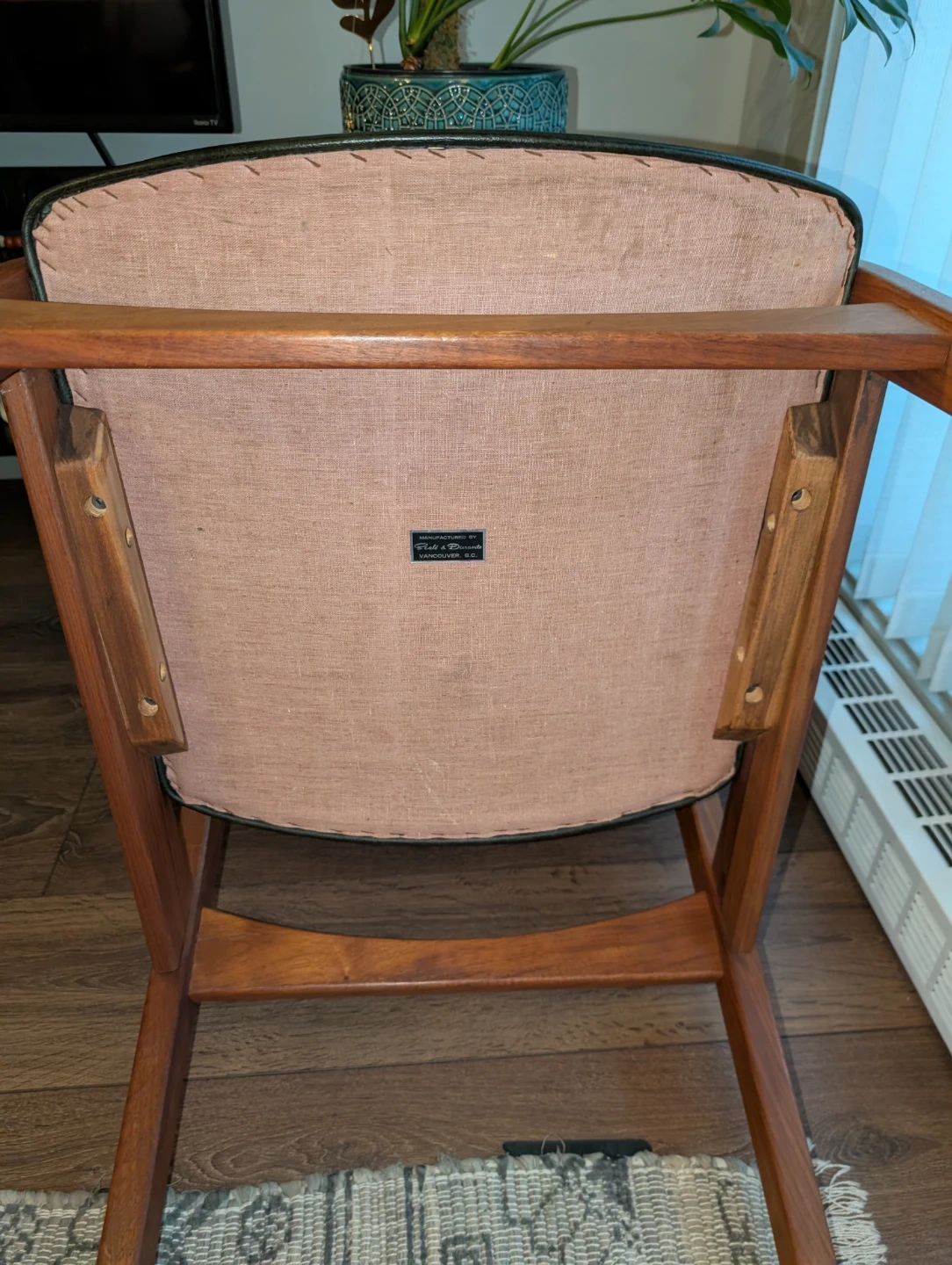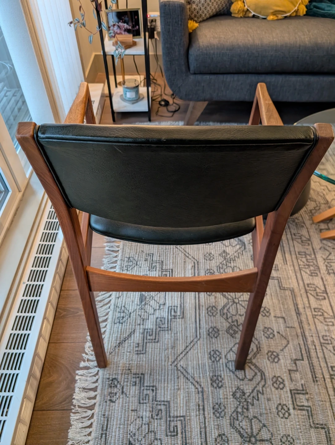 A beautiful accent chair with natural dark green leather. It has been in my possession for 9 years. The chair is in very good condition with a small hairline crack in one of the side panels.