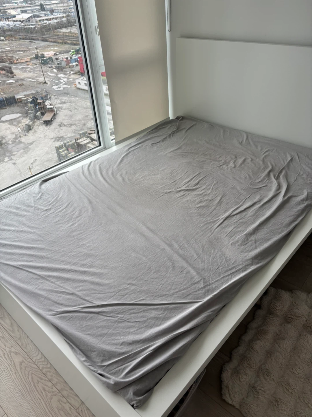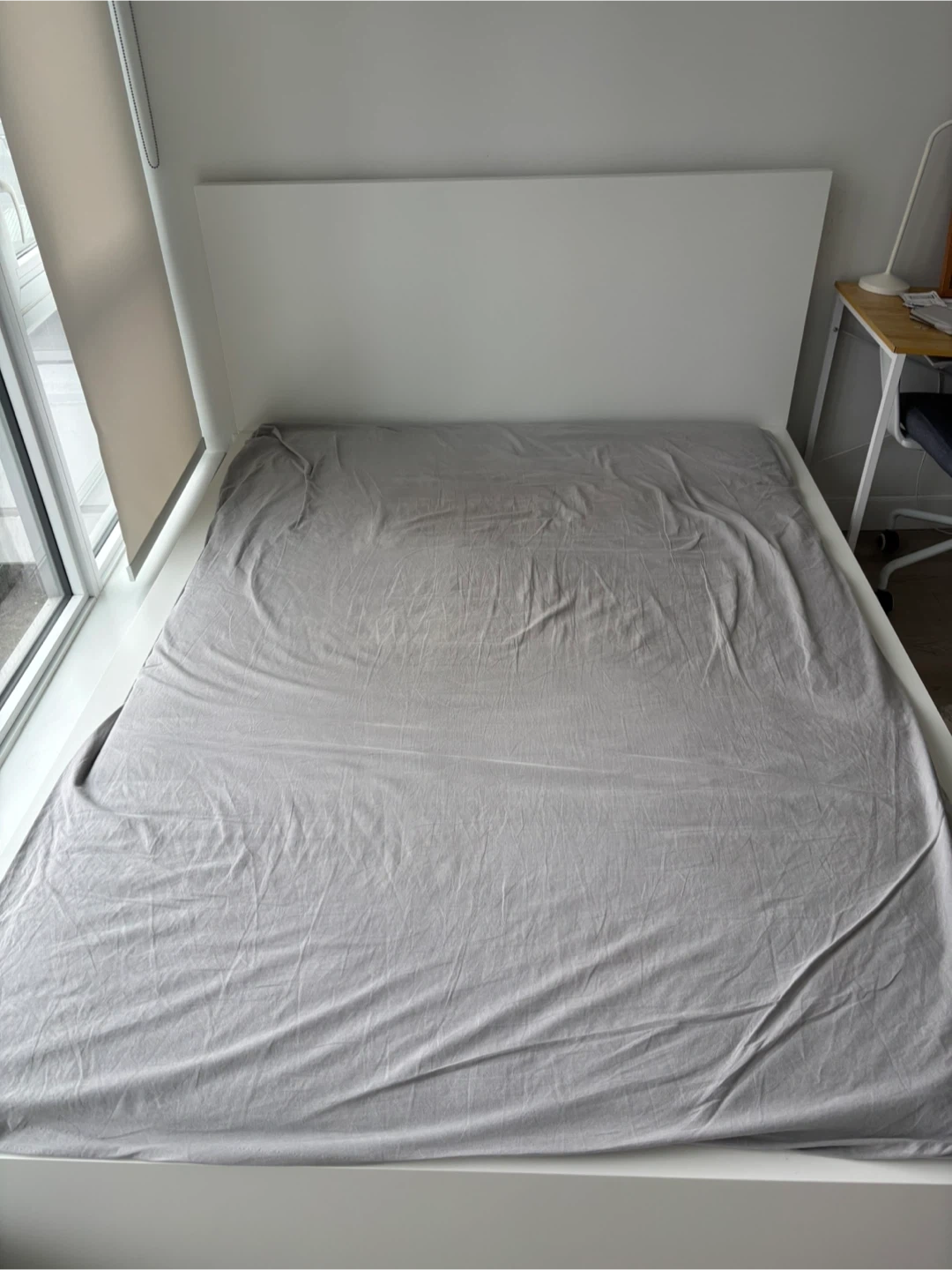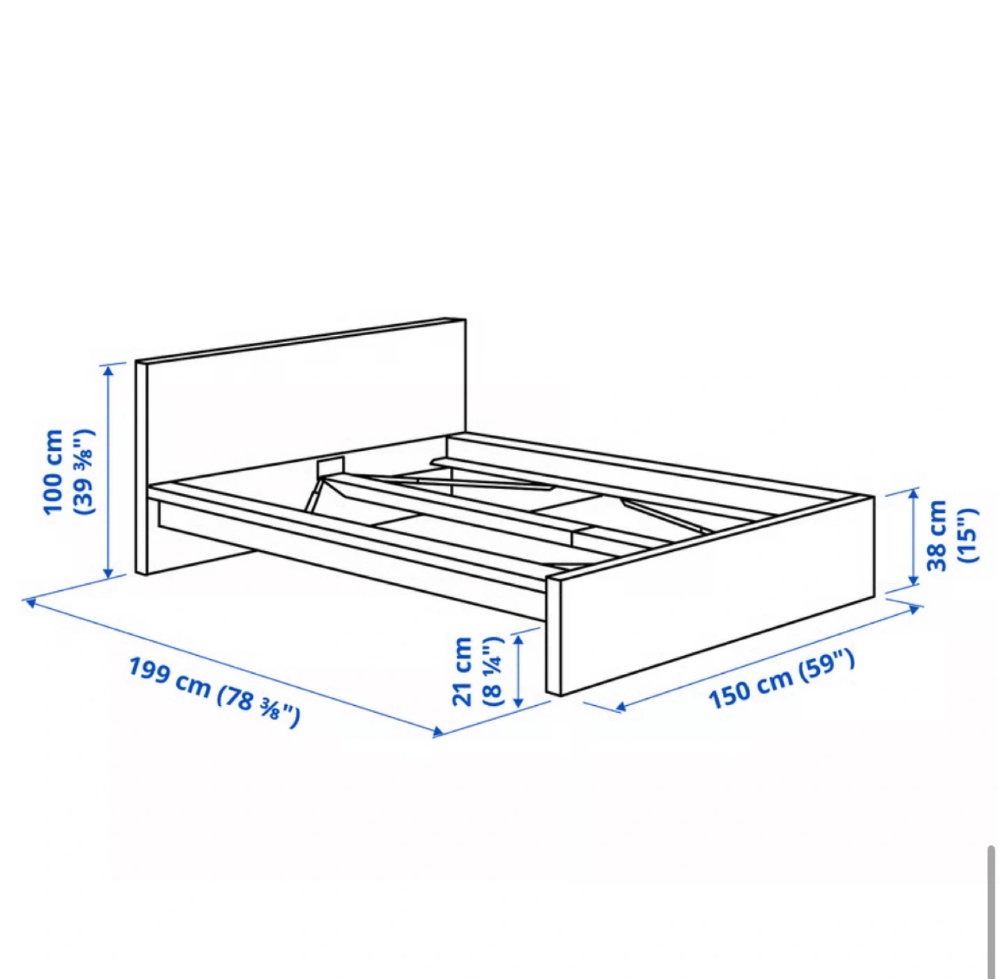 Selling a white IKEA MALM bed frame in queen size. Dimensions are approximately 199 cm (78 3/8") in length and 150 cm (59") in width. It's a simple and stylish bed frame that fits well in any bedroom!