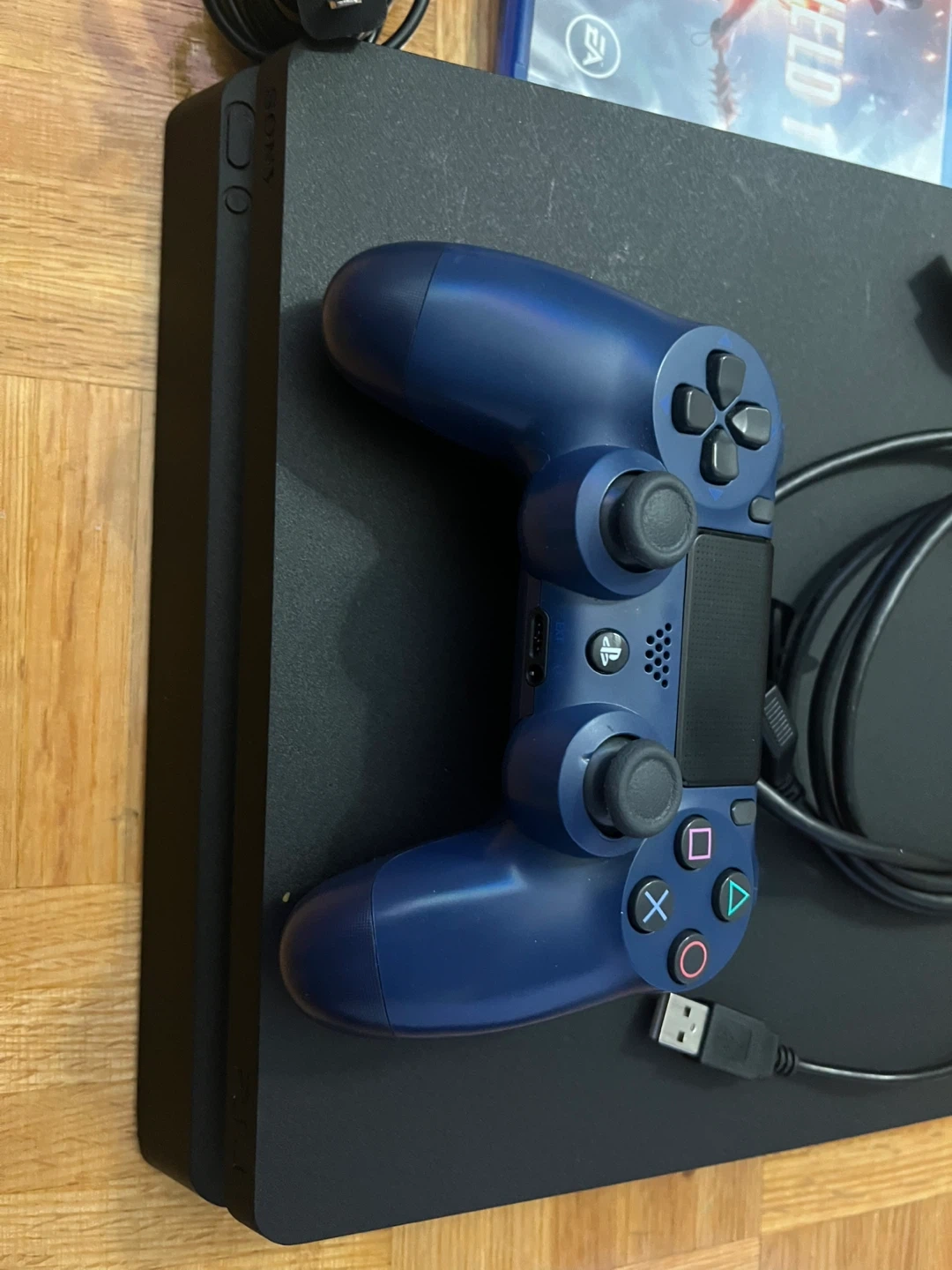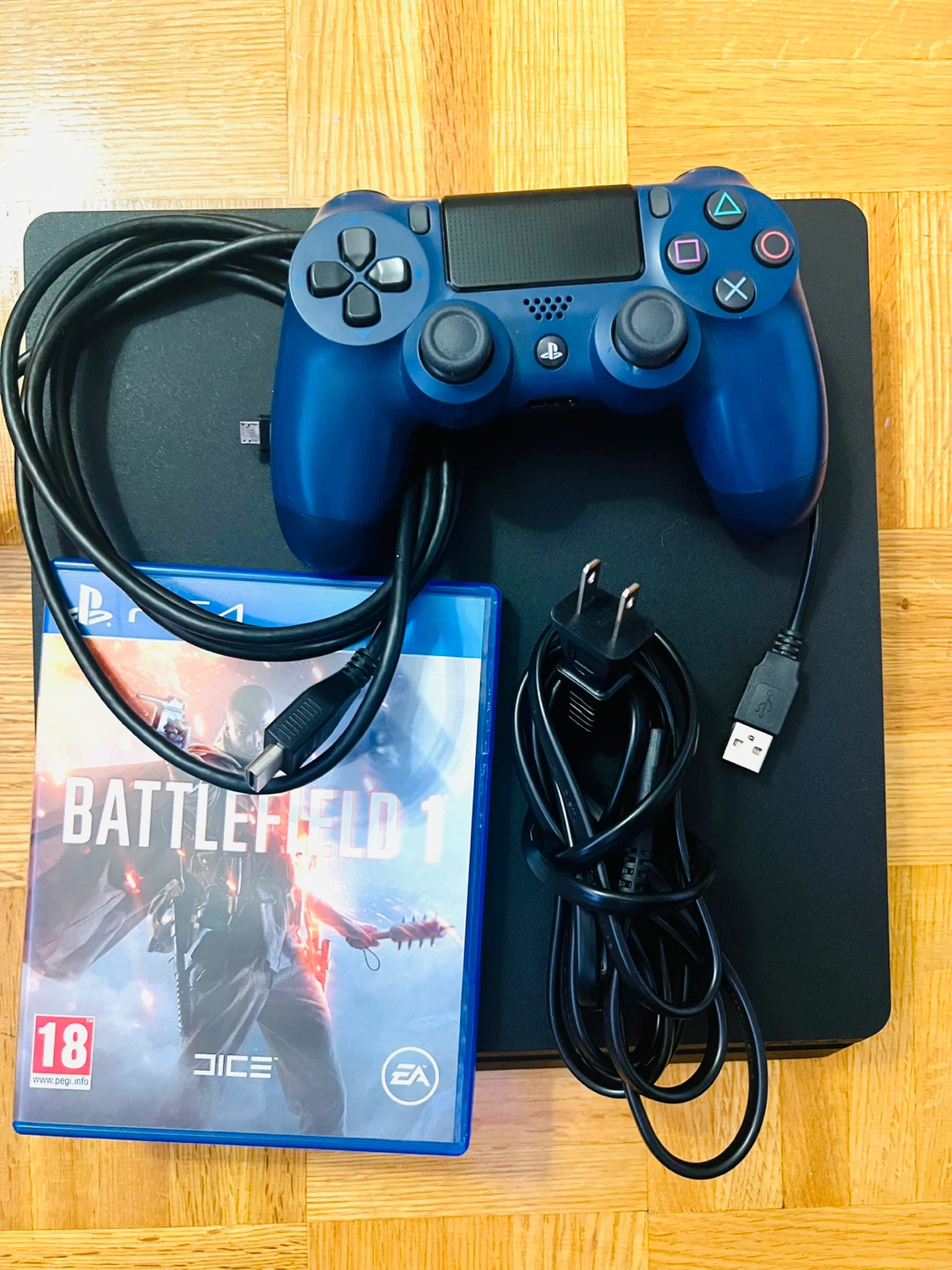 Selling a PlayStation 4 Slim 1Tb , complete with a blue controller and the game Battlefield 1. It comes with all the necessary cables to get you gaming right away!