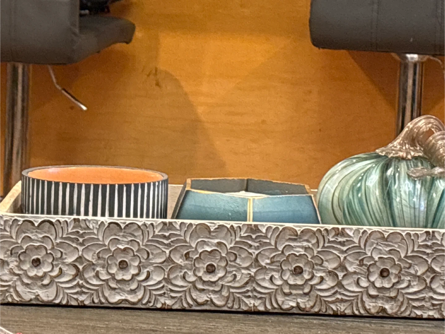 Selling a decorative tray that includes a striped candle holder, a blue candle holder, and a decorative pumpkin. It's a cute set to add a little something extra to your home decor