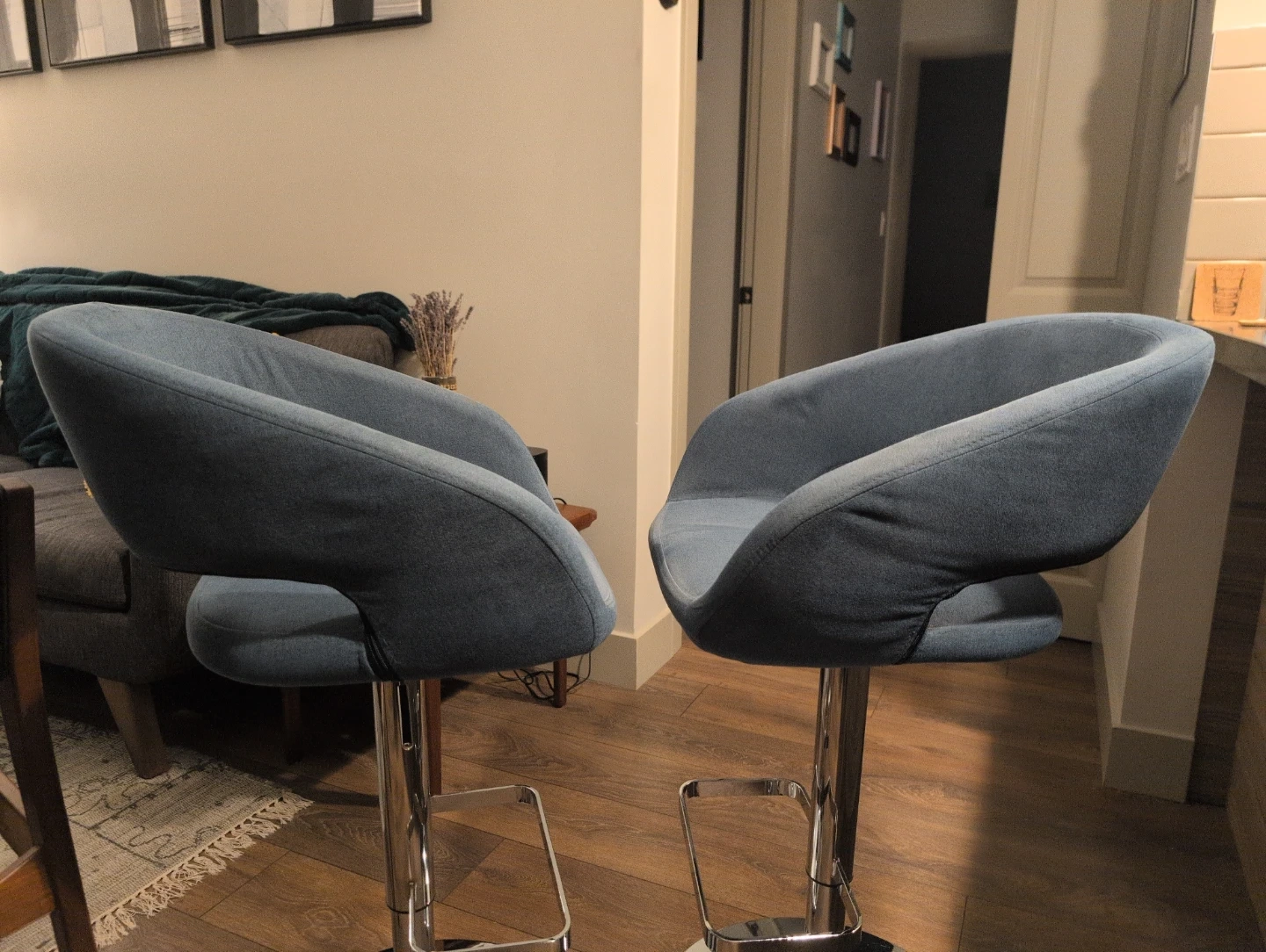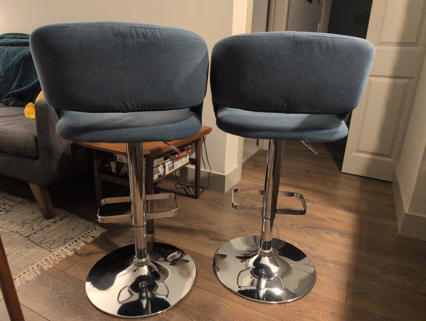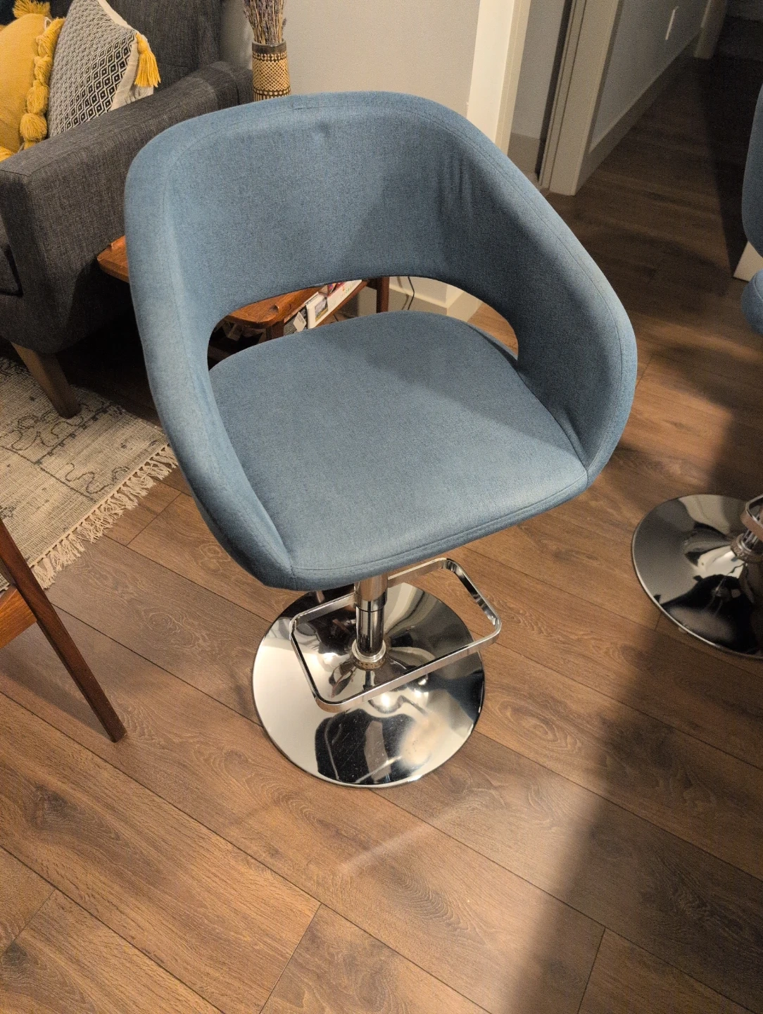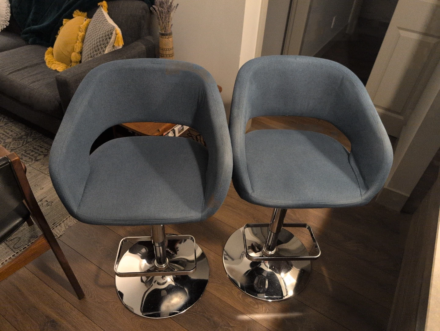 A set of two barstools in very good condition. Extremely comfortable with very deep seats and comfortable arm rests. The height adjustment and rotation works perfectly.